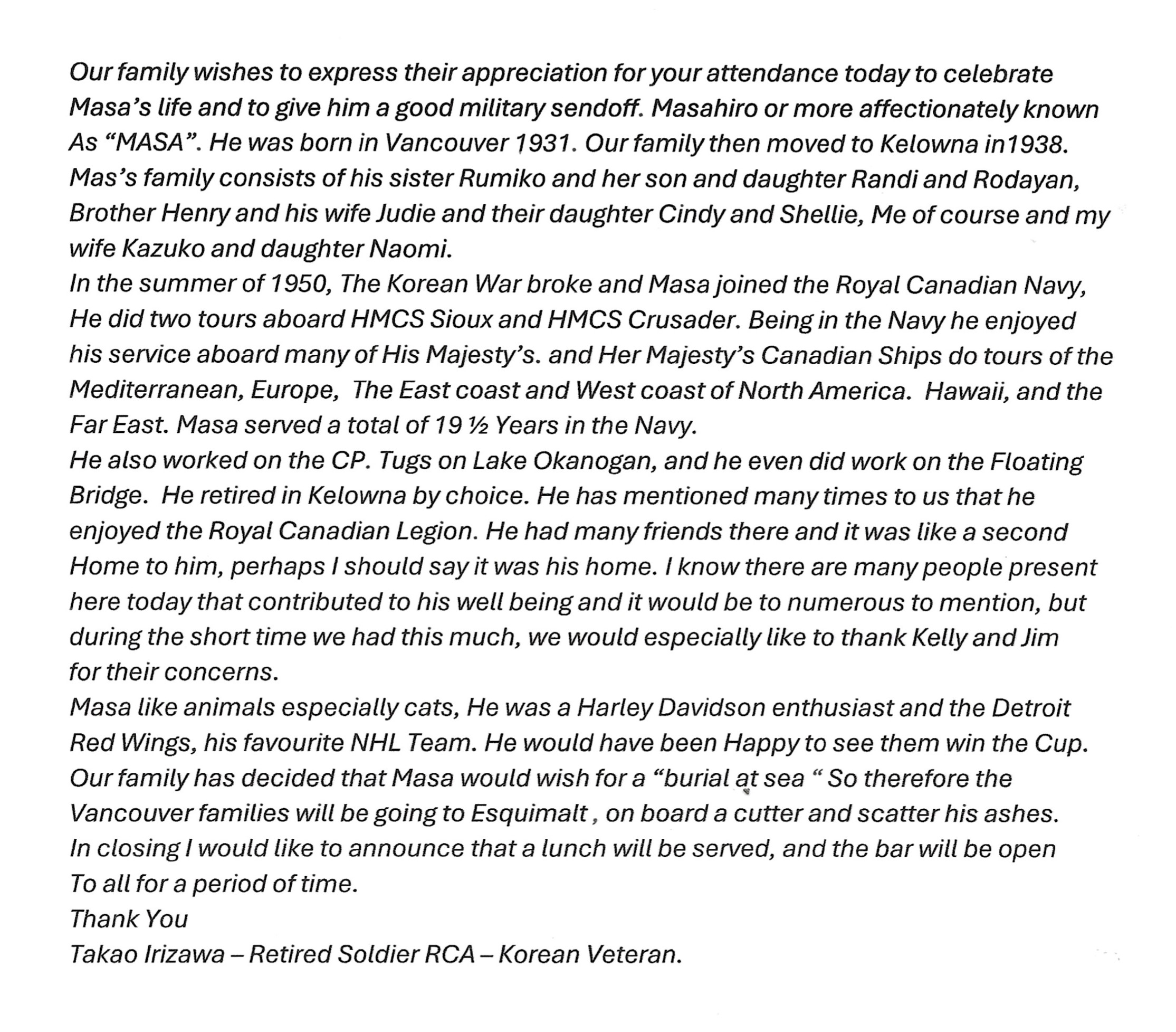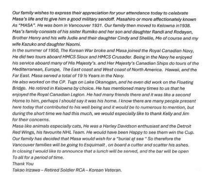 IRIZAWA, Masahiro (Masa) - passed away suddenly on June 11th, 2002 in his 72 year. Son of the late Junichi and Sumiko Irizawa. Survived and fondly remembered by his family: brother takao (Kazuko), Henry (Judie) and sister Rumiko (late Bob Iwata), nieces and nephews. Masa served in the Royal Canadian Navy and was a Korean War Veteran. A memorial gathering will be held on Saturday, June 15th, 2002 at 11:00 a.m. in the Royal Canadian Legion Branch #26, 1380 Bertram Street, Kelowna. Cremation. As a remembrance, friends may make a donation to the Heart and Stroke Foundation of B.C. and Yukon, 201-1456 St. Paul Street, Kelowna, B.C. V1Y 2E6, would be gratefully received. (The Kelowna Courier 14 Jun 2002)