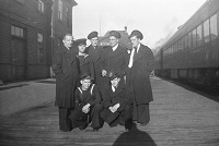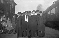(MB90) Marshall Burns (crouching, front, left) with unknown sailors at the train station in Moncton, NB (MB91) Marshall Burns (standing, 1st on left) with unknown sailors at the train station in Moncton, NB (MB92) Marshall Burns (left) with "Dit" Durdle - RCN Barracks - Jun 1942 (MB93) Johnny "Nails" Henbrey and "Dit" Durdle - RCN Barracks - Jun 1942