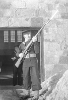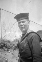 (MB14-MB15) Marshall Burns standing on the jetty in St. John's, Nfld, 1942, on duty as Jetty Sentry - note the lanyard attached to the pistol on his belt (MB16-MB17) Unknown sailor on the jetty - HMCS MINAS in the background (MB18) Lou Machuk on duty as Quartermaster on the jetty beside the brow of HMCS MINAS, Aug 1942