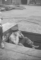 (MB37) Marshall Burns sitting on the edge of the gun deck above the new entrance to the seaman's mess in HMCS MINAS (MB38) Unknown sailor sitting above the new entrance to the seaman's mess on HMCS MINAS (MB39) McNiven on the port anchor of HMCS MINAS while she is in the slips - Aug 1942 (MB40) Dunlop and Ansley on the anchors of HMCS MINAS while she is in the slips - Aug 1942
