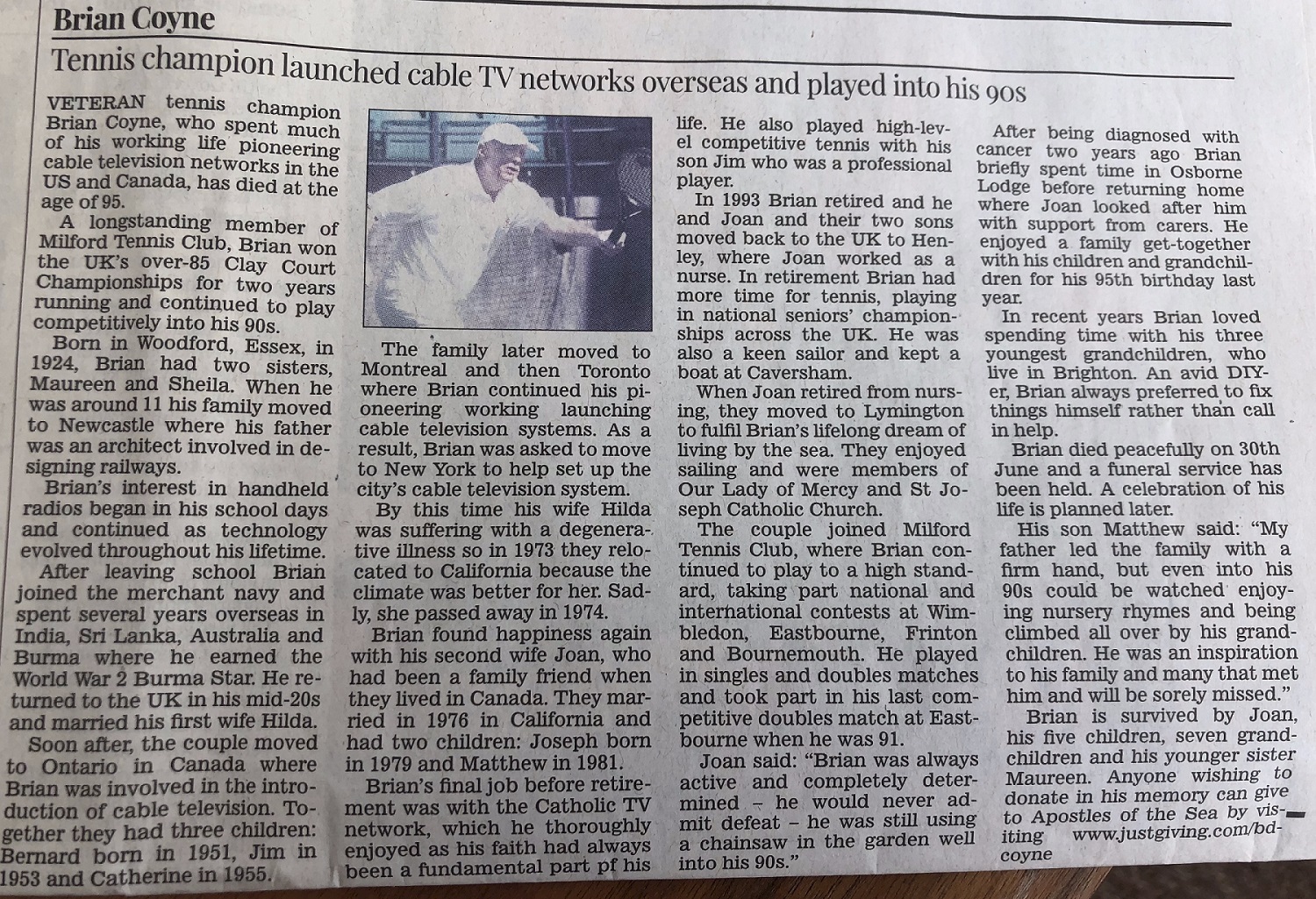COYNE, Brian Denis - On July 1 (Canada Day), Brian aged 95 years, passed away peacefully in his sleep. Born in the UK, he served in WWII and then after the war emigrated to Canada and then to the USA and in retirement returned to the UK. Brian was a pioneer in the cable TV business in Montreal, Toronto, Hamilton, and California. He was an active tennis player at the Hamilton Thistle Club, the Hamilton Tennis Club, the Burlington Tennis Club and the St. Catharines Tennis Club and played well into his 90's in the UK. He competed in tennis tournaments throughout Ontario, California and the UK. He was also a keen sailor for many years as a member of the Oakville Yacht Squadron sailing in Lake Ontario and then in San Francisco Bay. Beloved husband of Joan and previously Hilda (deceased '75) and inspirational father to Bernie, Jim, Catherine, Joseph and Matthew and to seven beautiful grandchildren. Forever in our thoughts, he will be sadly missed. Donations can be made to the Apostles of the Sea at www.justgiving.com/bdcoyne (The Hamilton Spectator 09 Jul 2020)