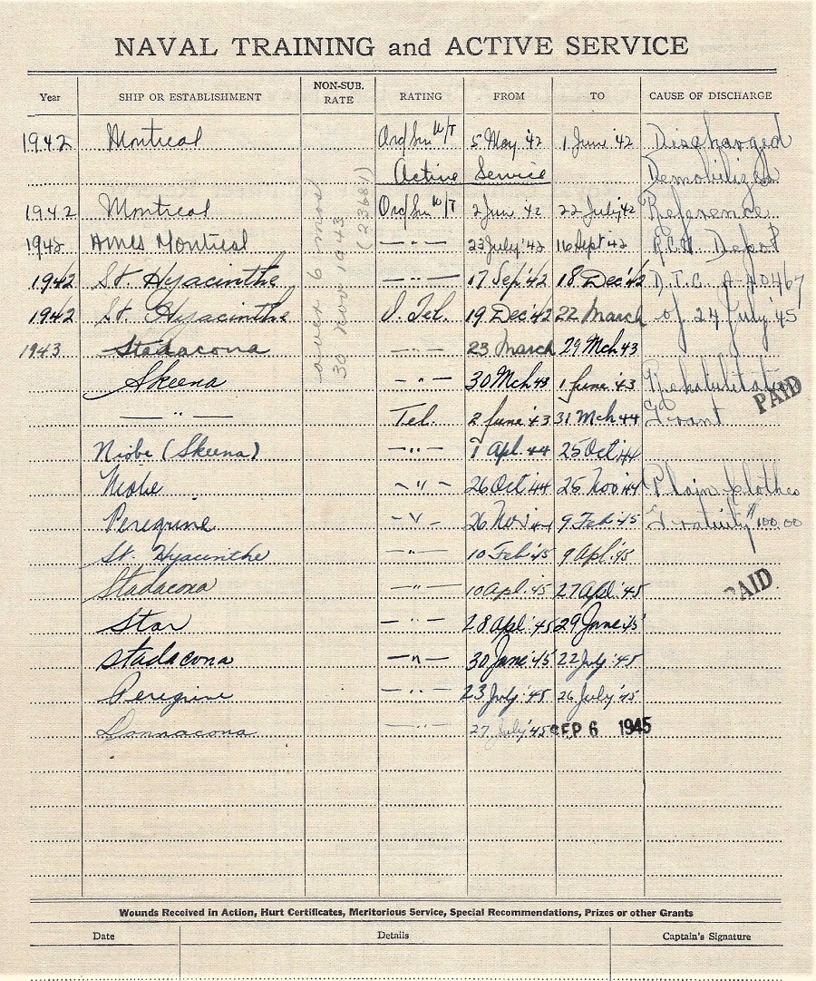 Ships served in: RCNVR DIVISION MONTREAL - Enlisted 05 May 1942. Commenced Active Service 02 Jun 1942 HMCS MONTREAL - Served in Montreal 2 Jul 1942 - 16 Sep 1942 HMCS SKEENA - Served in Skeena 30 Mar 1943 - 25 Oct 1944. Survived the grounding / wreck of HMCS SKEENA on 24 Oct 1944 HMCS DONNACONA - Demobilized 06 Sep 1945