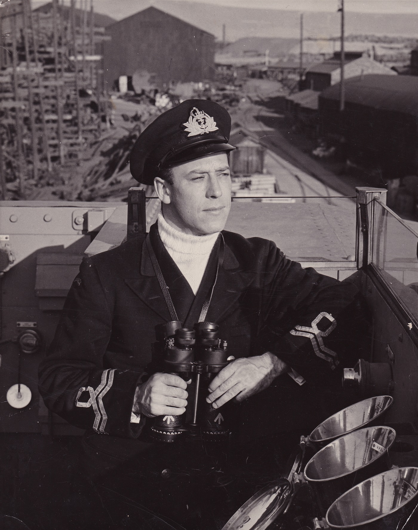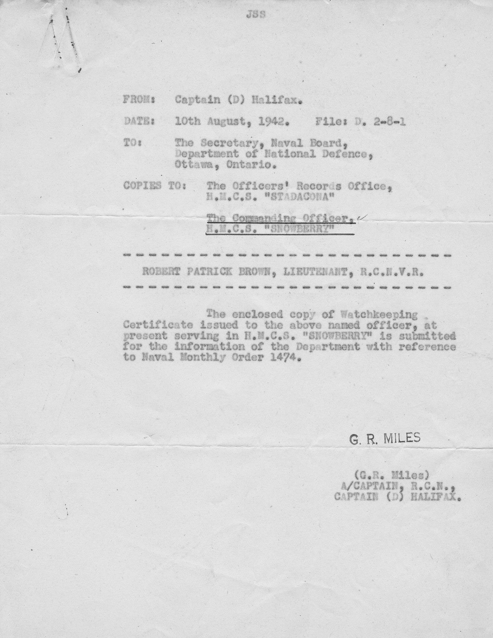 (RB01) Portrait of Lt Robert Brown (RB02) Lt Robert Brown on the bridge of HMCS KINCARDINE (RB03-RB04) Lt Robert Brown's Watch-Keeping Certificate for HMCS SNOWBERRY with cover letter - issued 10 Aug 1942 (RB05) Robert's promotion to A/LCdr effective 01 Jul 1945