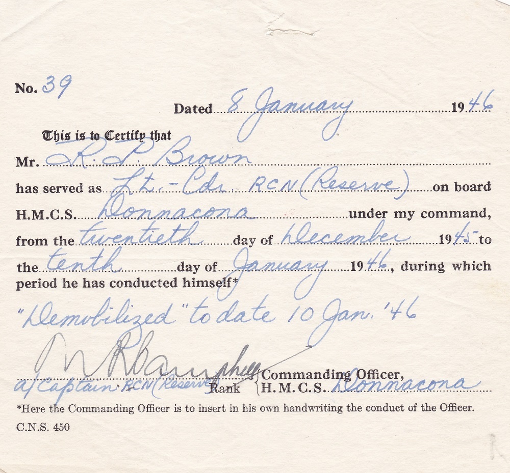 LCdr Robert Brown served in the RCNVR during the Second World War. After the war he was transferred to the RCN(R). He was demobilized on 10 Jan 1946.