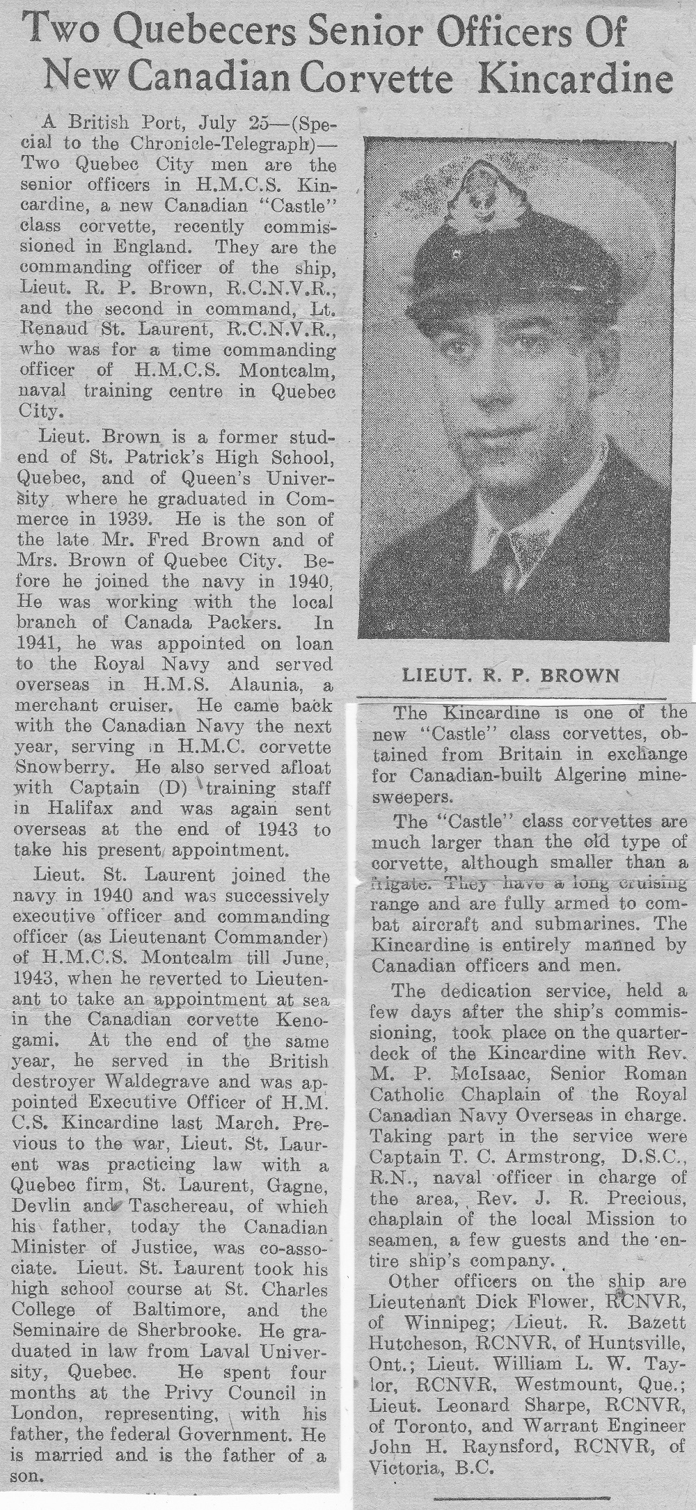 Ships served in: HMCS ROYAL ROADS - Appointed to Royal Roads 01 Jan 1941 as a Prob. SLt, RCNVR (Navy List Mar 1941) RCN BARRACKS HALIFAX - Appointed to RCN Barracks Halifax 27 Apr 1941 as a SLt, RCNVR (Navy List Jul 1941) * On loan to Royal Navy (Navy List Oct 1941) RCN BARRACKS HALIFAX - Appointed to RCN Barracks Halifax 07 Jan 1942, For Disposal or Under Training as a SLt, RCNVR (Navy List Jan 1942) HMCS SNOWBERRY - Appointed to Snowberry 04 Feb 1942 as a Lt, RCNVR (seniority 19 Feb 1942) (Navy List Apr 1942) RCN BARRACKS HALIFAX - Appointed to RCN Barracks Halifax 05 Jun 1943, For Disposal or Under Training as a Lt, RCNVR (Navy List Aug 1943) HMCS STADACONA (Depot Ship Halifax) - Appointed to Stadacona, Staff of Captain D, Halifax, 01 Sep 1943 as a Lt, RCNVR (Navy List Oct 1943) HMCS KINCARDINE - Appointed to Kincardine 09 Mar 1944 (while ship under construction) as a Lt, RCNVR. // Re-Appointed to Kincardine 19 Jun 1944 as a Lt, RCNVR, Commanding Officer (Navy List Jul 1944). Promoted and re-appointed to Kincardine as a LCdr, RCNVR, CO eff 01 Jul 1945 (service file of LCdr R.P. Brown) HMCS DONNACONA - Served in Donnacona 20 Dec 1945 - 10 Jan 1946 as a LCdr, RCN(R) (service file of LCdr R.P. Brown) * Appointment Terminated (Demobilized) 10 Jan 1946 as a LCdr, RCN(R) (Navy List Apr 1946)