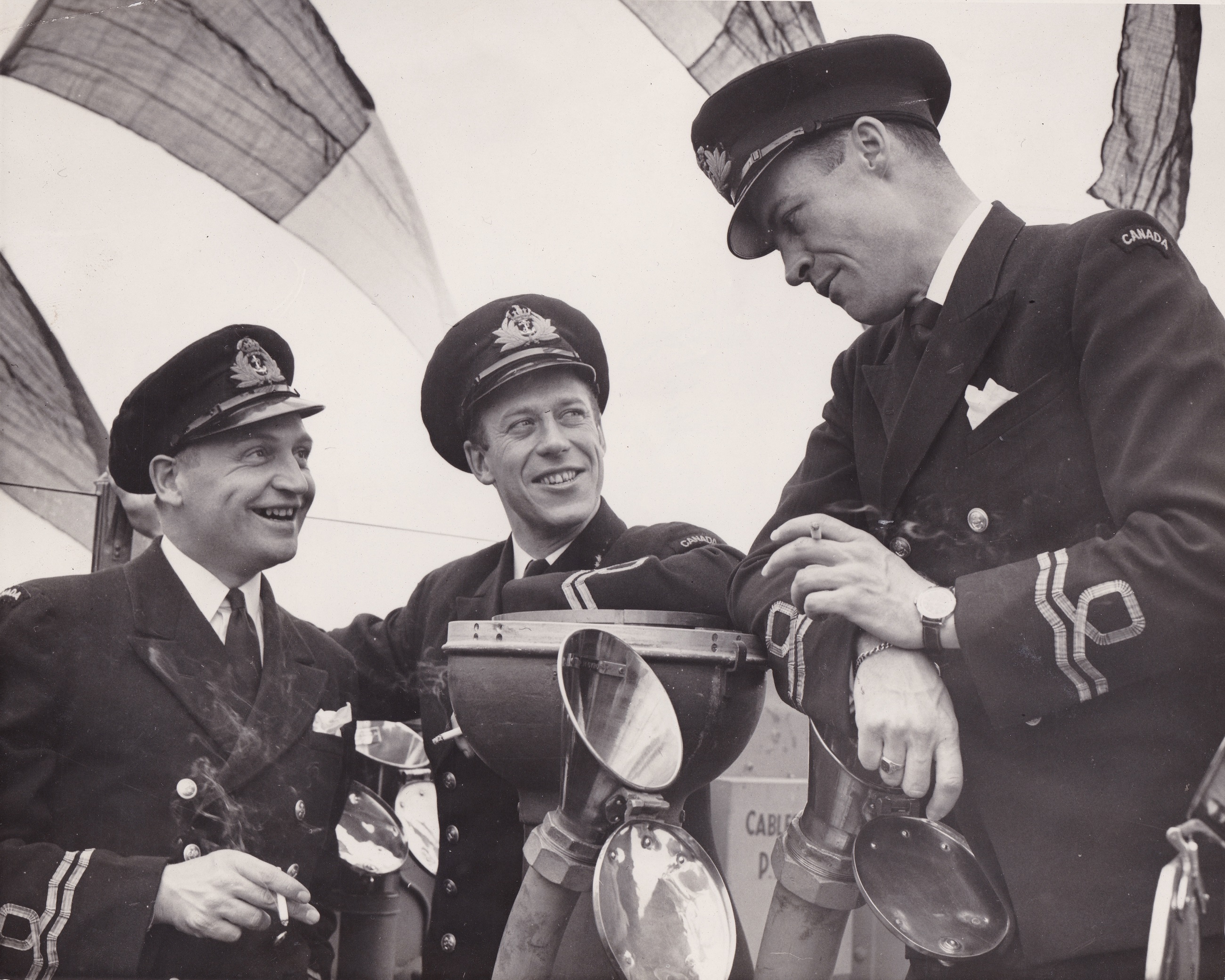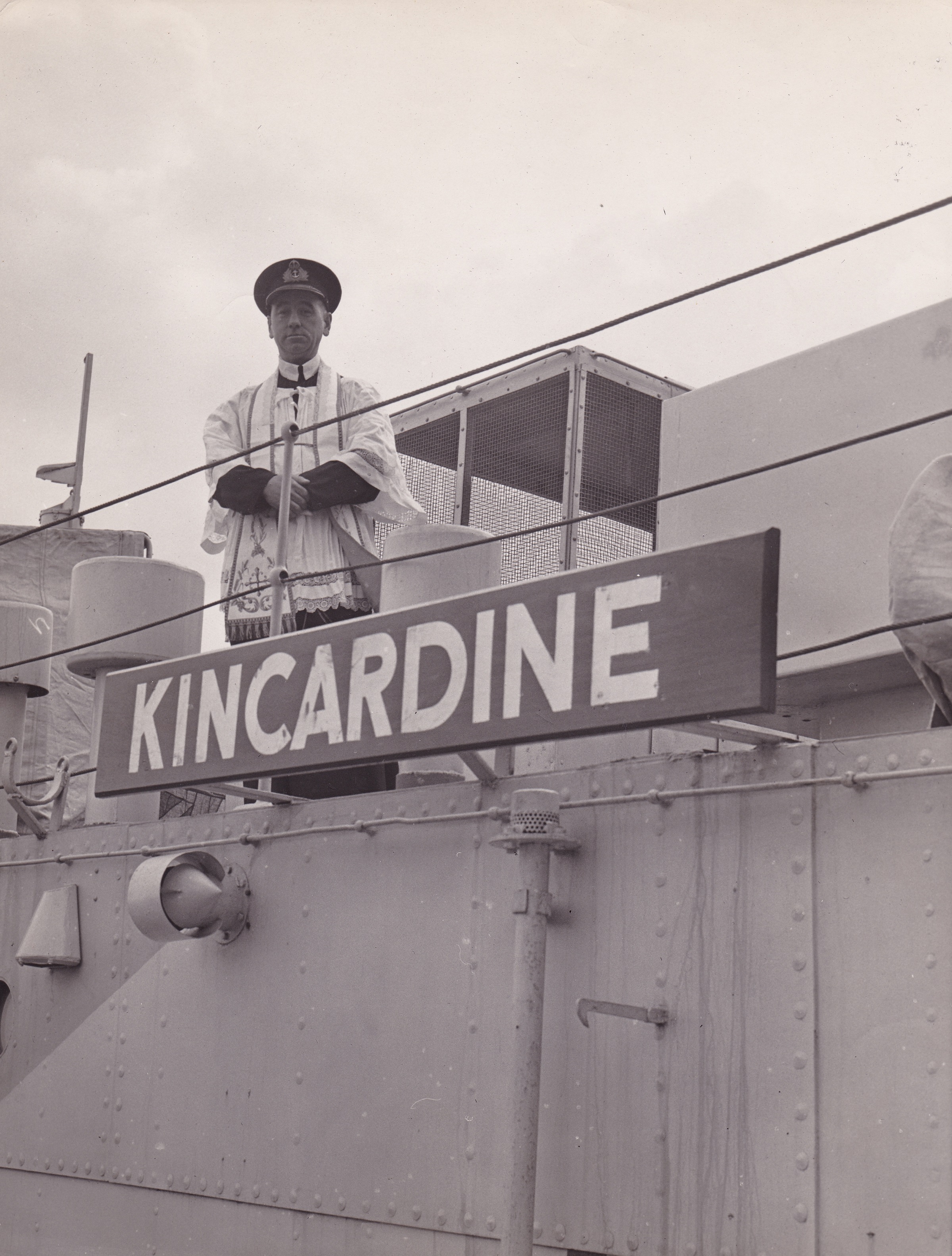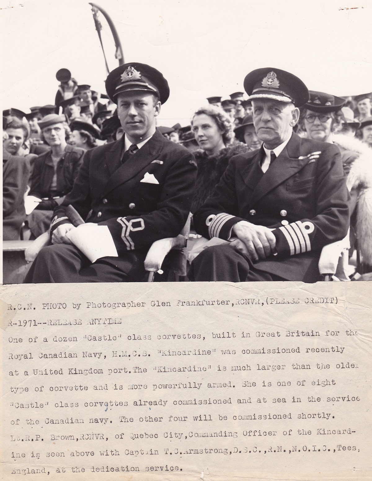 (RB12) Press release on the commissioning of HMCS KINCARDINE in the U.K. The CO of KINCARDINE, Lt Robert Brown (left) and Capt. T.C. Armstrong, DSC, RN, NOIC, Tees, England at the commissioning ceremony (RB13) Unidentified chaplain presiding over the commissioning ceremony (RB14) Prayers held on HMCS KINCARDINE during the commissioning ceremony (RB15) Lt Robert Brown, CO of HMCS KINCARDINE on the bridge with two of his officers on commissioning day (RB16) Service held onboard HMCS KINCARDINE. It is not known if it is related to the commissioning of the ship.