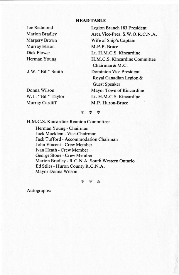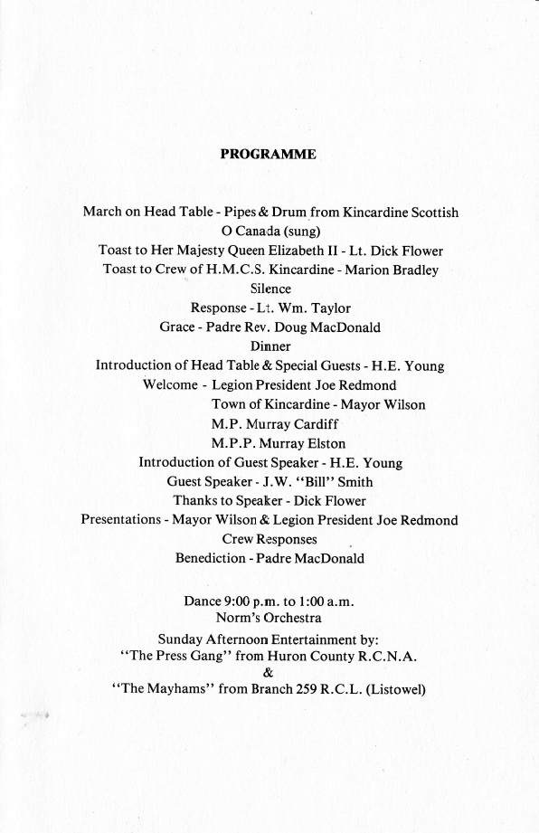 (RB27) Speech by J.W. (Bill) Smith, guest speaker at the 1st Kincardine Reunion - PDF file (RB28) Brief history of HMCS KINCARDINE (RB29-RB30) Newspaper articles on the 1st HMCS KINCARDINE Reunion