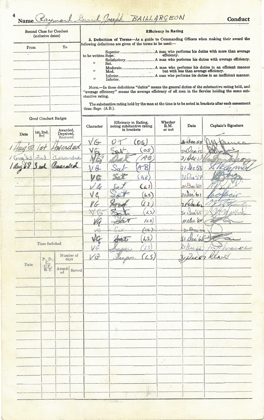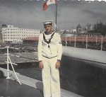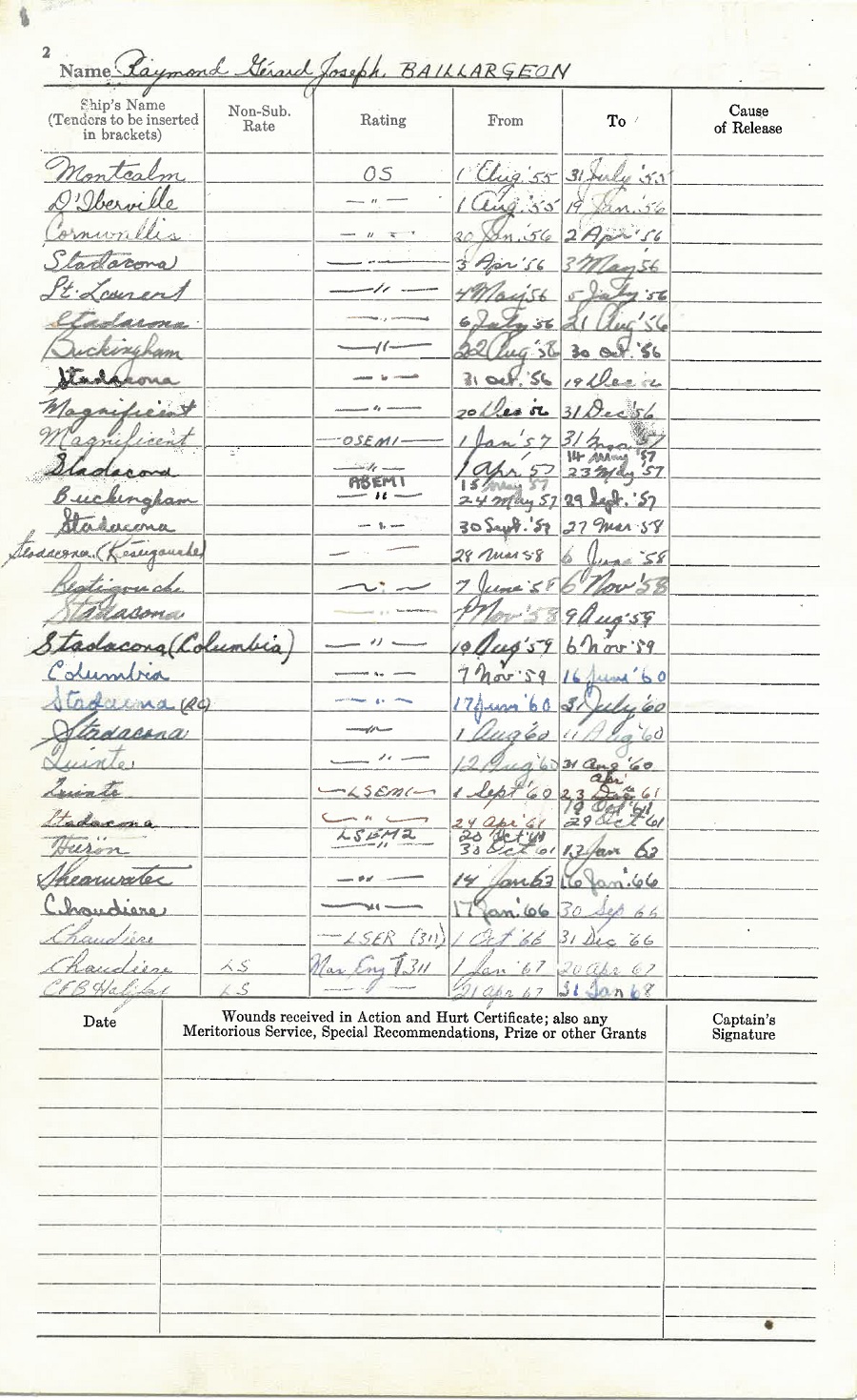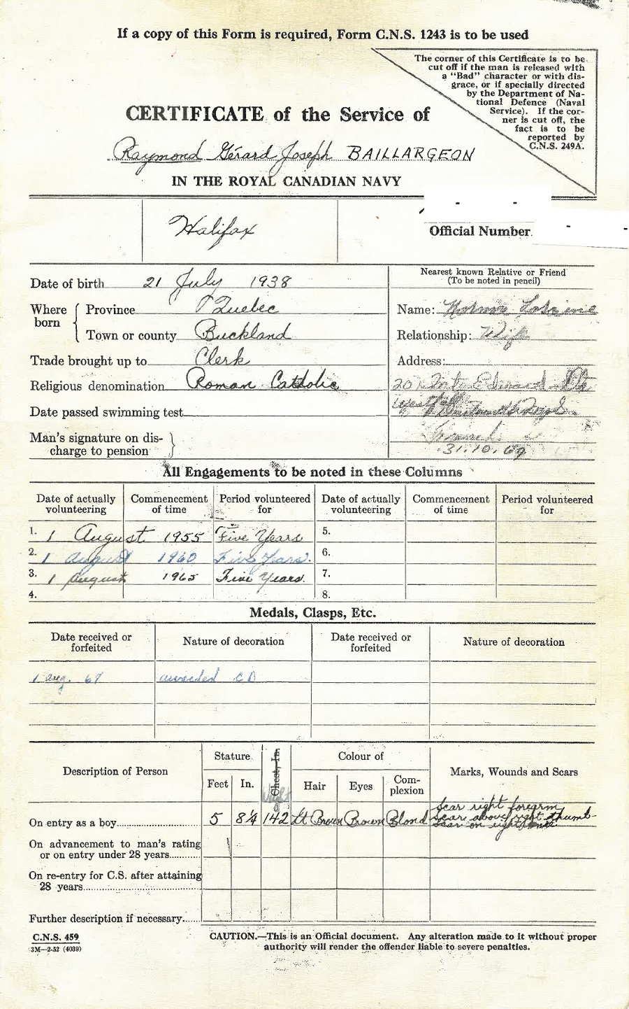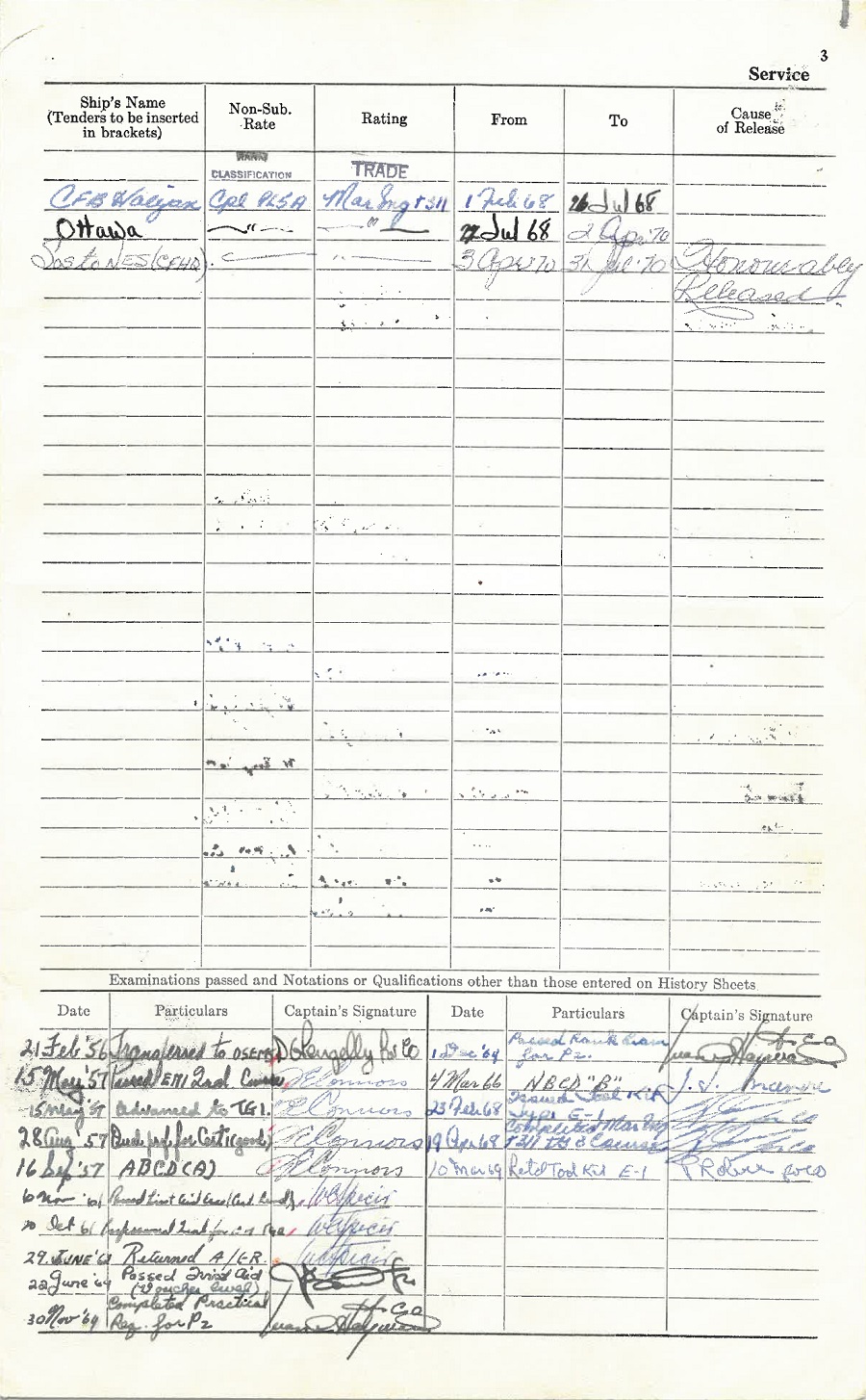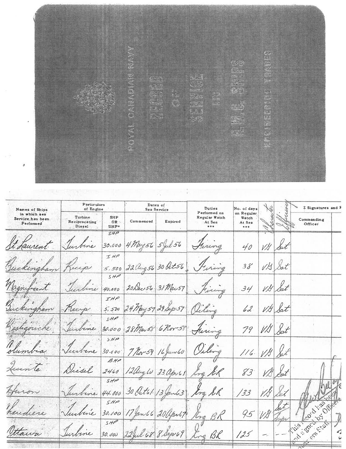 Ships served in: HMCS MONTCALM - Served in Montcalm 01 Aug 1955 - 31 Jul 1955. Enlisted 01 Aug 1955 HMCS D'IBERVILLE - Served in D'Iberville 01 Aug 1955 - 19 Jan 1956 HMCS ST LAURENT - Served in St Laurent 04 May 1956 - 05 Jul 1956 as an OS, RCN HMCS BUCKINGHAM - Served in Buckingham 22 Aug 1956 - 30 Oct 1956 as an OS, RCN HMCS MAGNIFICENT - Served in Magnificent 20 Dec 1956 - 31 Mar 1957 as an OS and OSEM1, RCN. Rated OS.EM1 01 Jan 1957 HMCS BUCKINGHAM - Served in Buckingham 24 May 1957 - 29 Sep 1957 as an AB.EM1, RCN HMCS RESTIGOUCHE - Served in Restigouche 28 May 1958 - 06 Nov 1958 as an AB.EM1, RCN HMCS COLUMBIA - Served in Columbia 07 Nov 1959 - 16 Jun 1960 as an AB.EM1, RCN HMCS QUINTE - Served in Quinte 12 Aug 1960 - 23 Apr 1961 as an AB and LS.EM1, RCN. Rated LS.EM1 01 Sep 1960 HMCS HURON - Served in Huron 30 Oct 1961 - 13 Jan 1963 as an LS.EM2, RCN HMCS CHAUDIERE - Served in Chaudiere 17 Jan 1966 - 20 Apr 1967 as an LS.EM2 and LS.ER, RCN HMCS OTTAWA - Served in Ottawa 22 Jul 1968 - 02 Apr 1970 as an LS.ER, C.A.F. * Honourably Released 31 Jul 1970