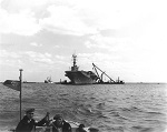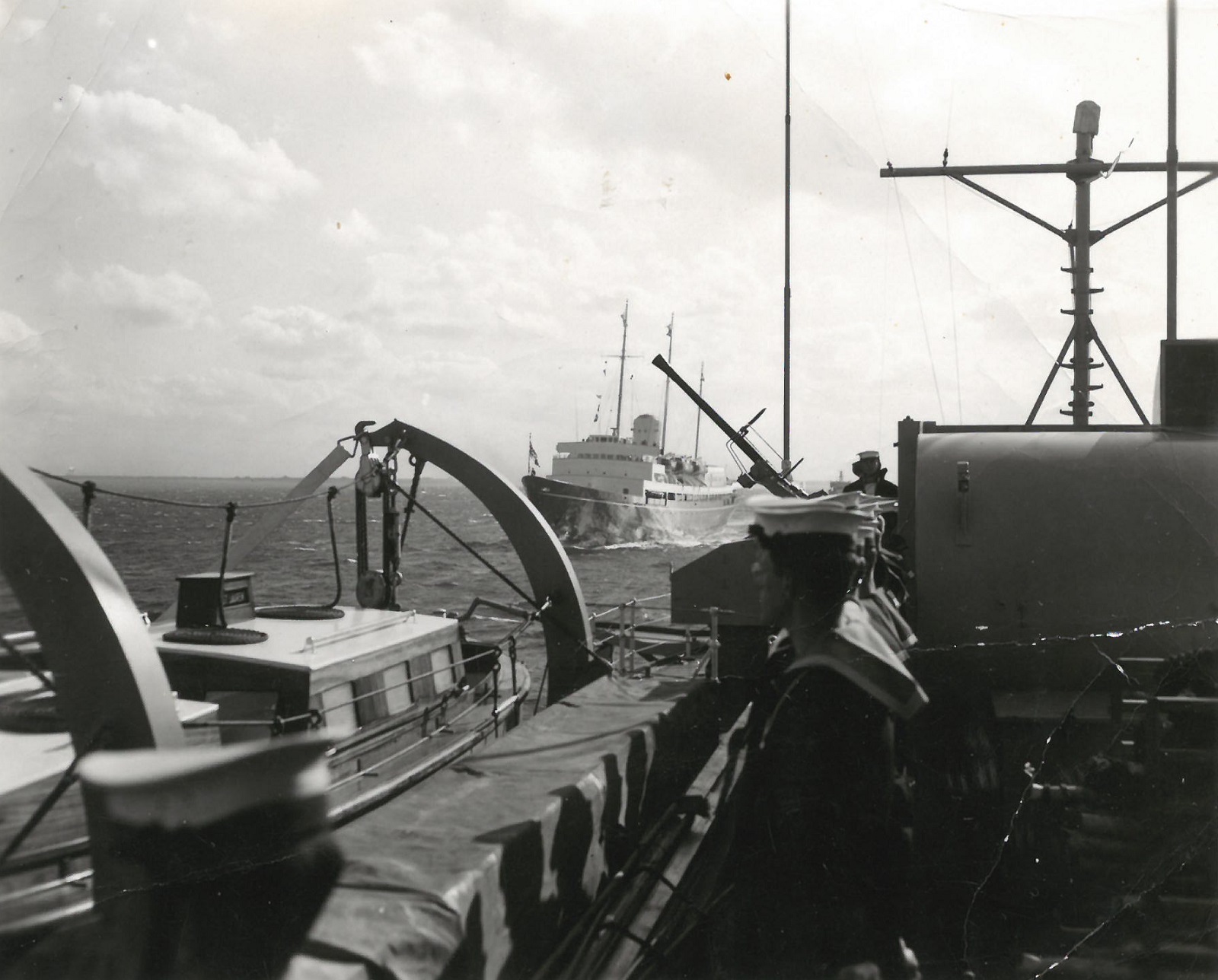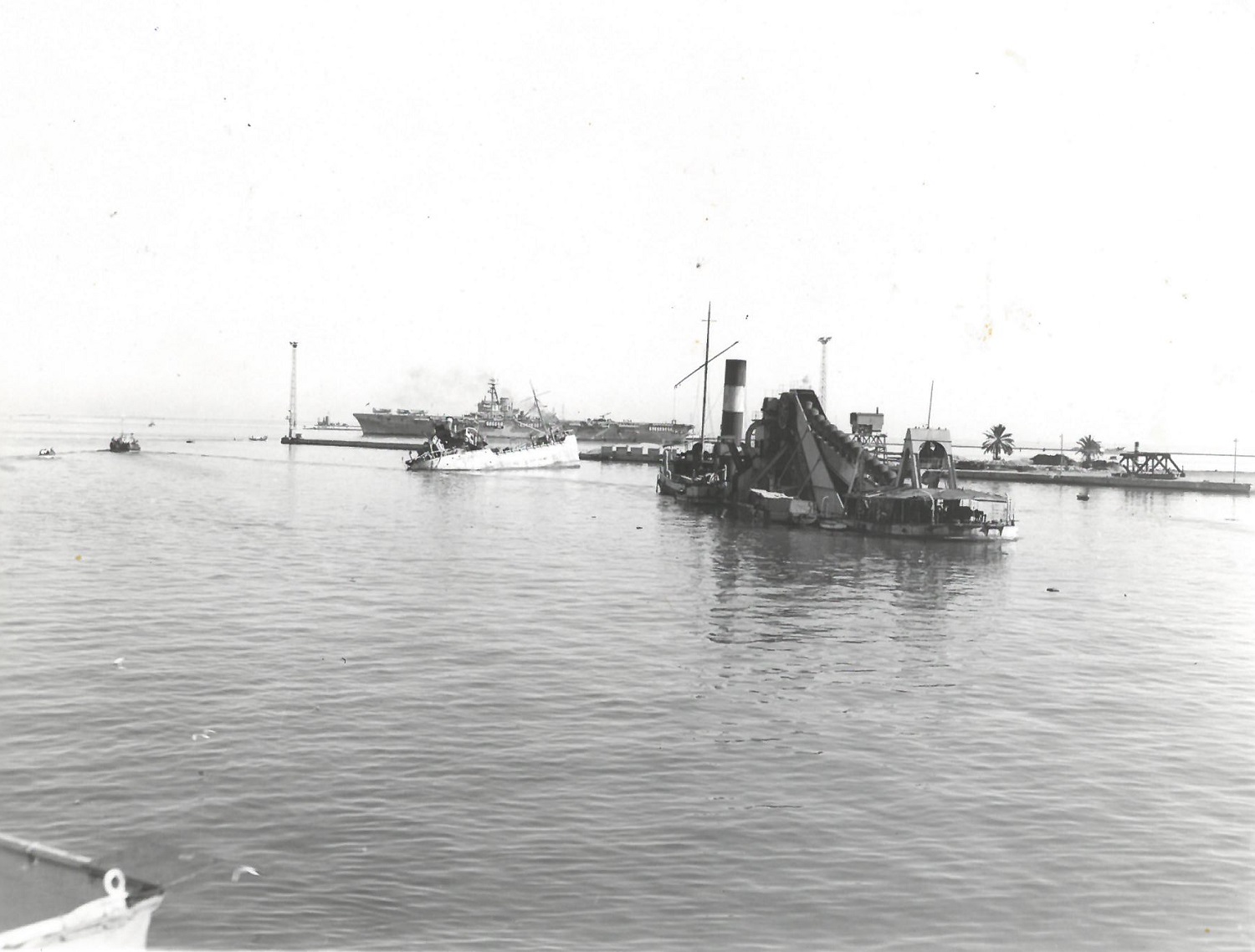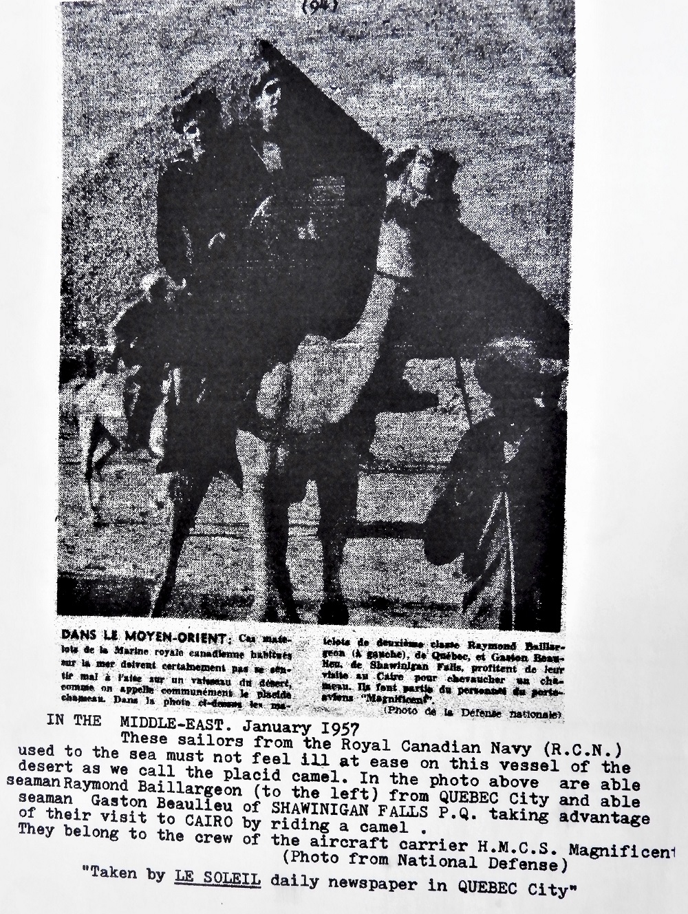 (RB20) Vessels sunk in the Suez Canal (RB21) Article on AB Ray Baillargeon and AB Gaston Beaulieu taking a ride on a camel in Cairo during MAGNIFICENT's deployment to the Suez Crisis. In the photo Ray is sitting behind the cameleer (RB22) HMCS Magnificent from a US tanker in the Black Sea during her deployment for the Suez Crisis from Dec 1956 - Mar 1957