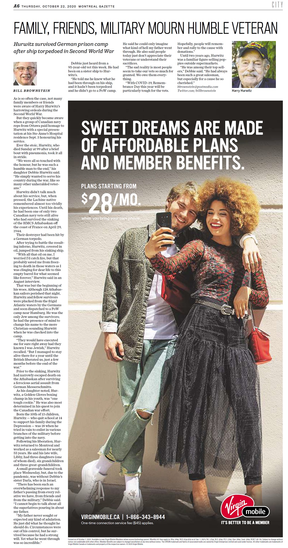 Friends, Family, Military Mourn Humble Veteran Montreal Gazette, 22 Oct 2020, Page A6 by Bill Brownstein Posted with permission of the Montreal Gazette