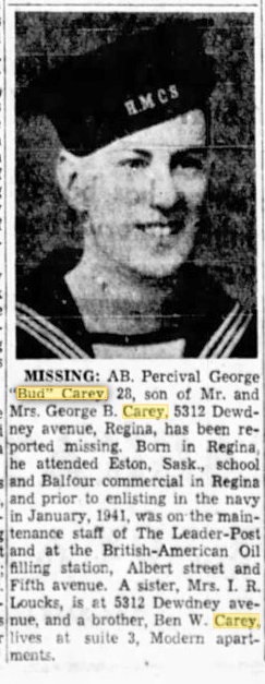Able Seaman Percival George Carey was the foster son of George B. and Elsie Florence Carey. Percival was working for British American Oil as a service station attendant before serving two months in the Regina Rifles, then transferring to the Navy on November 20, 1940 at Regina, Saskatchewan. He attended Eston Saskatchewan school and Balfour Commercial in Regina prior to enlisting. Survived by a sister, Mrs. I. R. Loucks and a brother Ben W. Carey.