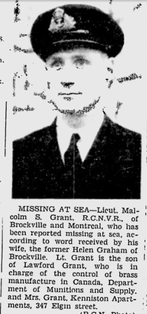 GRANT, Malcolm Seafield, Lt, RCNVR  MPK - 21 Aug 1944 HMCS ALBERNI - Son of Lawford S.F. and Nancy Grant, of Ottawa, ON; husband of Helen Lois Grant, of Brockville, ON.
