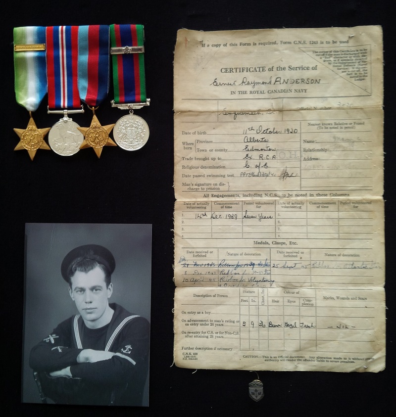 ANDERSON, Ernest Raymond - joined the Royal Canadian Navy on 14 December 1939. He served on HMCS ATHABASKAN and survived her sinking, being picked up by HMCS HAIDA. The following is from his daughter, Karen Anderson. "My dad really never talked about his days in the war, he was just never the boastful kind of person. My mom does remember his brother telling her a story about my dad, on the ATHABASKAN on the night it sank. He mentioned how he was with one of the guns that exploded, he was thrown into the water and a lot of the men he was with were killed. He was a very strong swimmer and was able to swim to be rescued. He was covered in oil and had bad burns on his hands. He told me he remembers coming out being covered in oil and being filmed on a camera. I do know these burns on his hands gave him pain and limitations for his whole life."