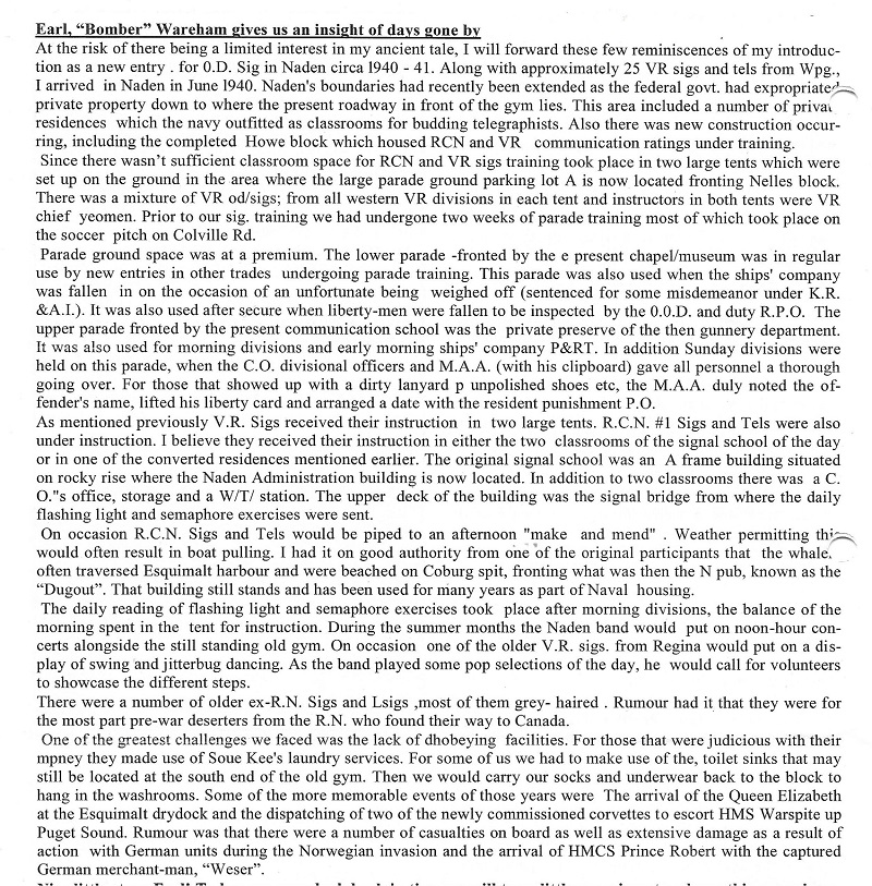 Earle (Bomber) Wareham gives us an insight to days gone by From the Chiefs and Petty Officers' Association (Esquimalt) Newsletter