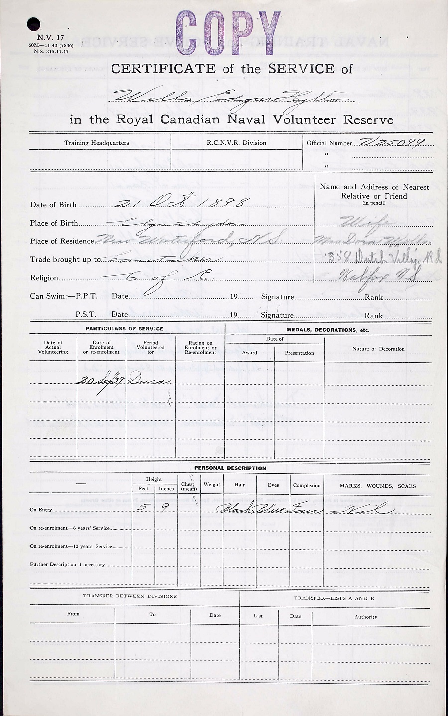 Yeoman of Signals Edgar Hilton Wells had a distinguished record of service, in the navy; both in the this war and the First World War. In the last war, he had the distinction of serving with King George VI, aboard H.M.S. Collingwood, in the battle of Jutland. He was also proud of his achievement of service. He served on a submarine, at the time of the Baltic fighting in Russia, in 1920. In addition he served with the Royal Irish Constabulary, and was retired with a pension from this force when it was disbanded in 1922. At the outbreak of the present war Mr. Wells was called into service with the Canadian Navy, and was posted to a station in Sydney for a time but was later called to Halifax where he served at various stations. Besides his widow, who resides at 353 Dutch Village Road, one daughter survives, Mrs. Evelyn Feacey also living on Dutch Village Road.