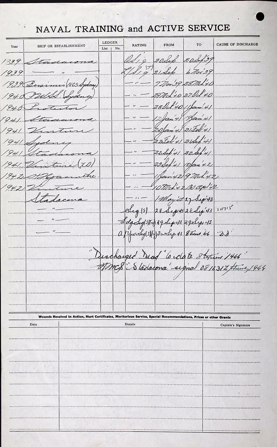 Ships served in: HMCS BERSIMIS - Served in Bersimis 07 Nov 1939 - 28 Mar 1940 HMCS SYDNEY RIVER - Served in Sydney River 29 Mar 1940 - 27 Oct 1940 HMCS SYDNEY RIVER - Served in Sydney River 21 Feb 1941 - 21 Sep 1941 HMCS VENTURE - Served in Venture 23 Sep 1941 - 11 Jan 1942 HMCS VENTURE - Served in Venture 10 Mar 1942 - 30 Apr 1942
