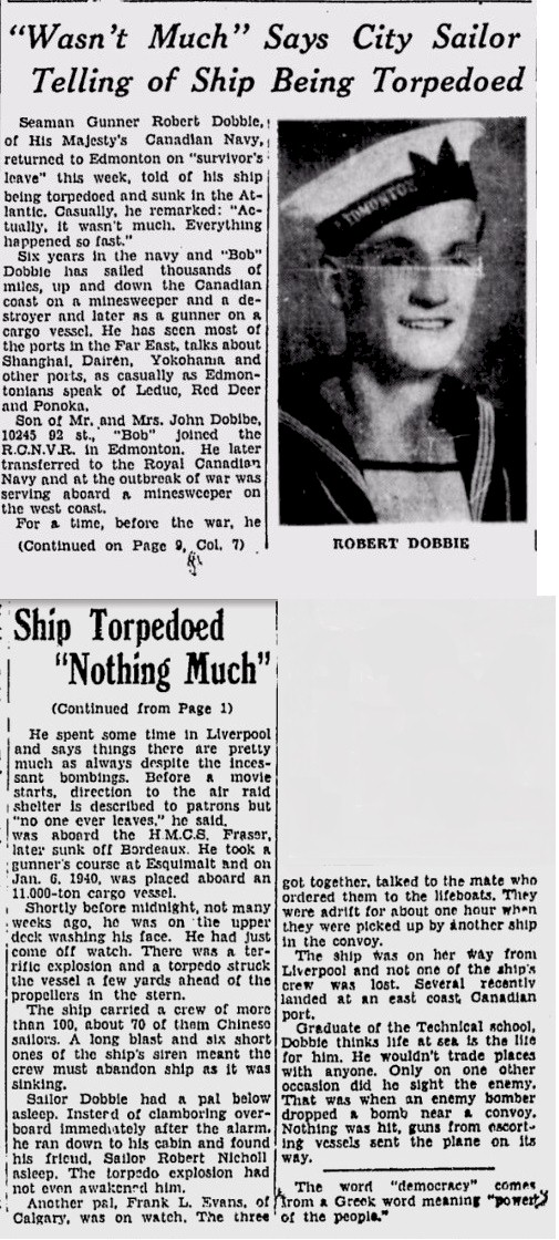 DOBBIE Robert H. (RD) Passed away December 25, 2006 in Victoria. Born in Edmonton, January 21, 1918, he is survived by his wife Marguerite (Midge), his daughter Michelle Hampson and son Scott (Laurie) Dobbie. He also leaves his step-children Linda (Marc), Ken (Eiren), Bruce (Joyce), Mark (Laurie), Joanne (Brian), twelve grandchildren, three great-grandchildren, a sister Joy (Bill) Betzler, and many nieces and nephews. He will be sadly missed, and remembered for his wonderful sense of humor. A Memorial will be held at a later date. In Lieu ol flowers, donations may be made to the Alzheimers Society of BC. (Vancouver Sun 29 Dec 2006) The article below is believed to be the same person as the above obituary for Robert H. (RD) Dobbie, but to date (13 Sep 2020) this has not been confirmed.