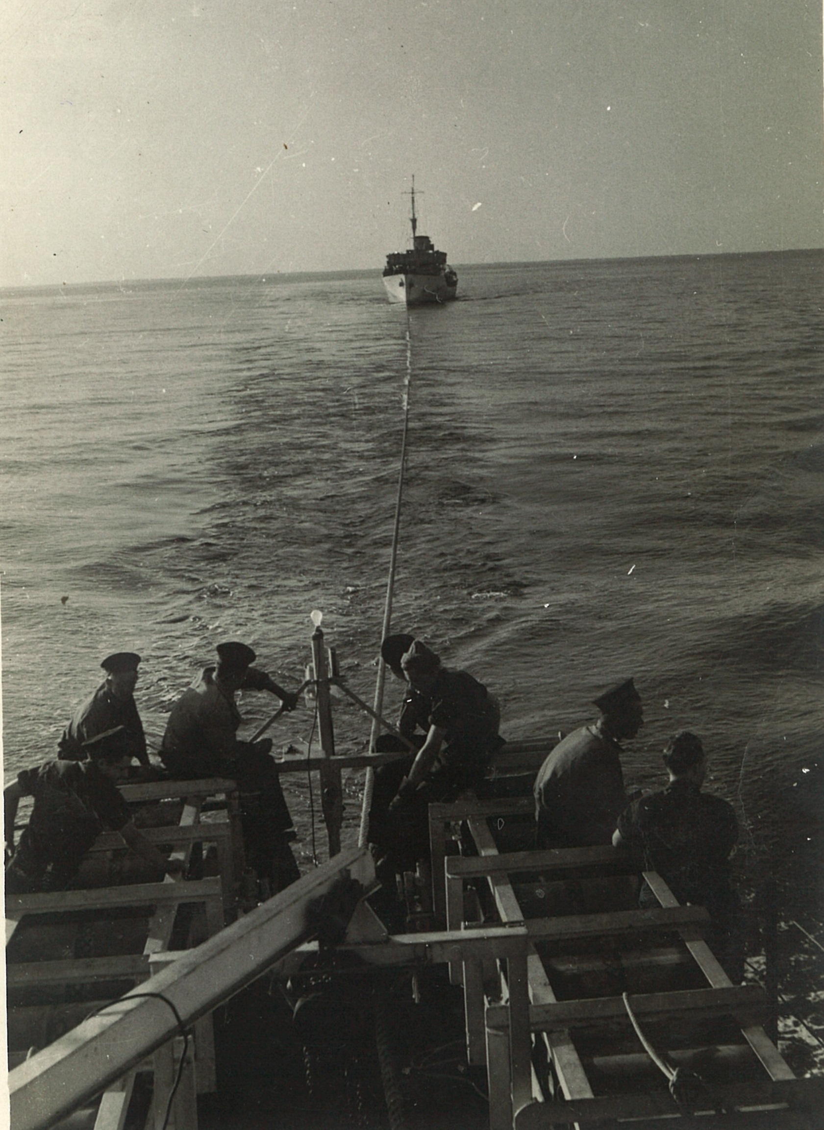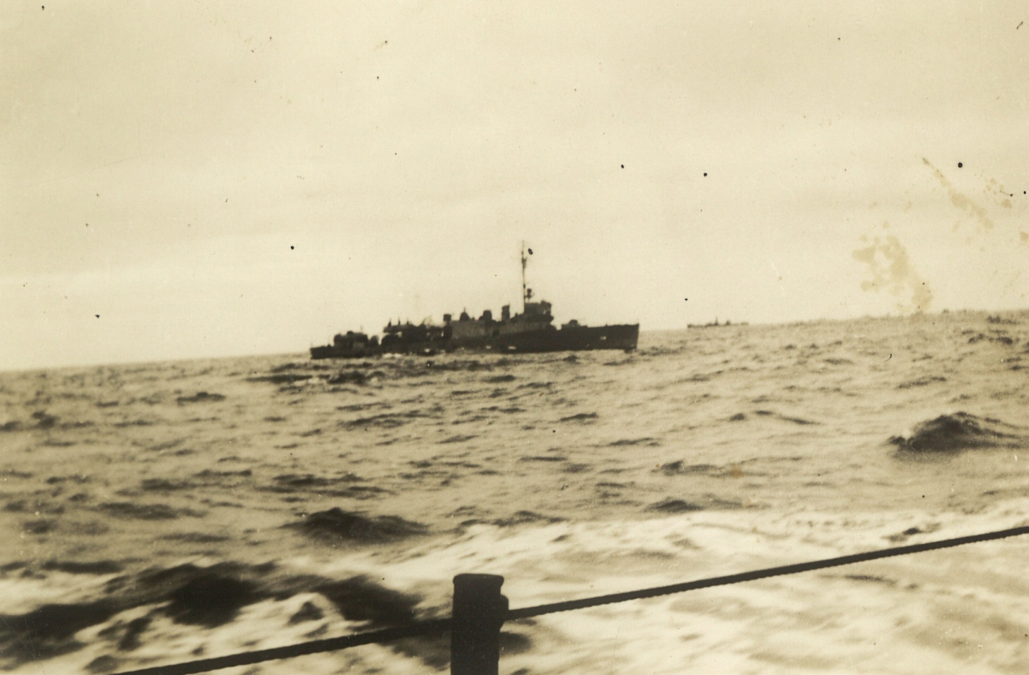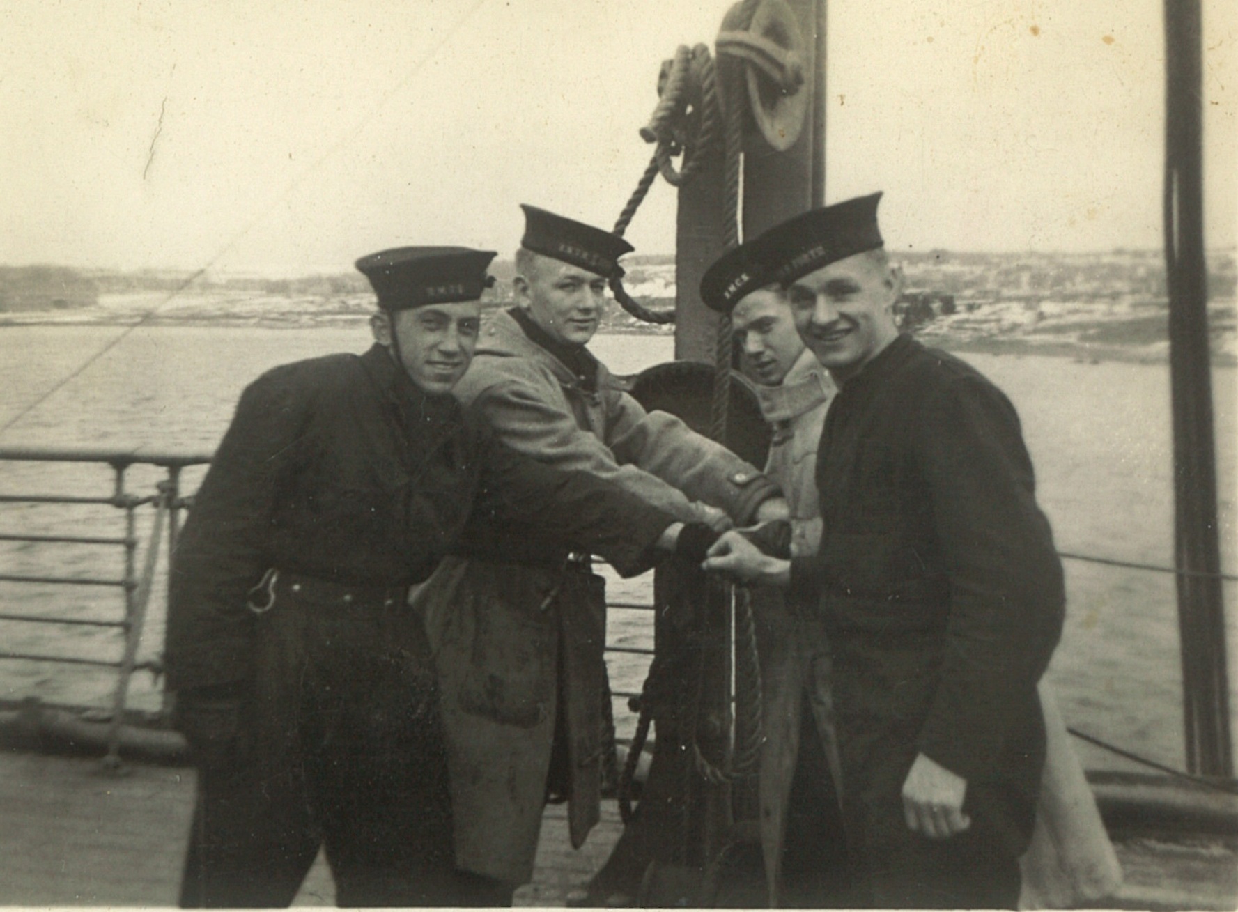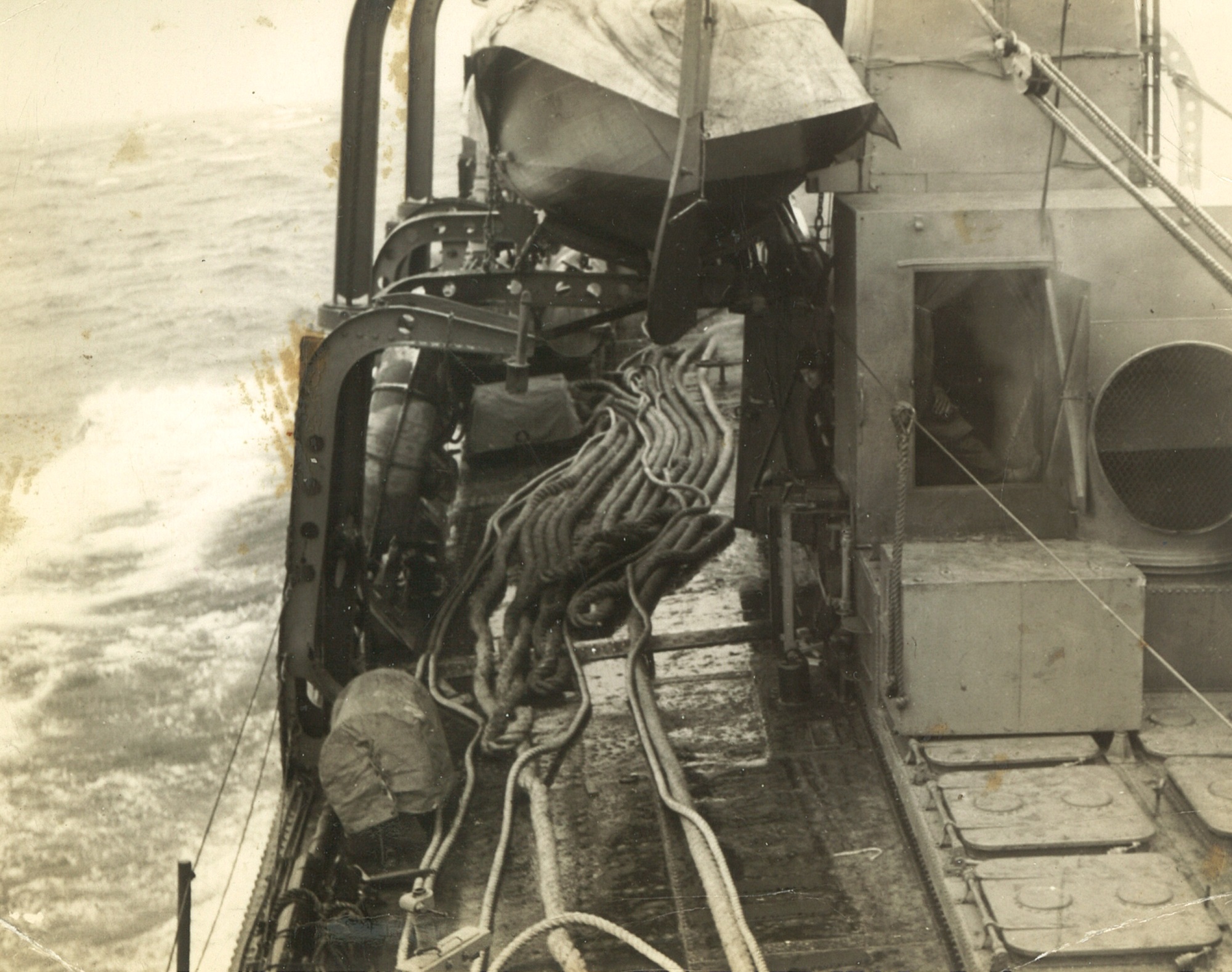 (CC28) HMCS ANNAPOLIS towing a corvette (CC29) L-R: Unknown, Campbell, Simms, Kells on HMCS ANNAPOLIS (CC30) HMCS ANNAPOLIS - looking forward from just aft of the torpedo tubes (CC31) Unidentified sailors working on the depth charges on HMCS ANNAPOLIS (CC32) LTO Claude Campbell (left) with shipmate on the stern of HMCS ANNAPOLIS