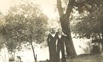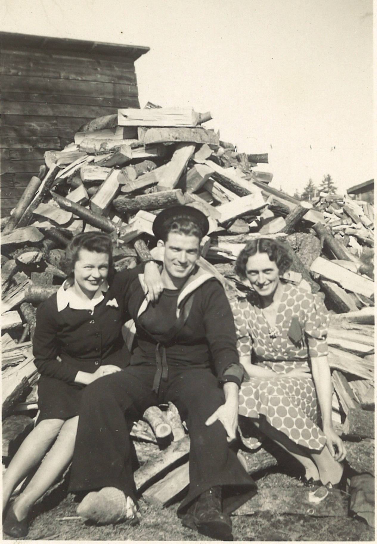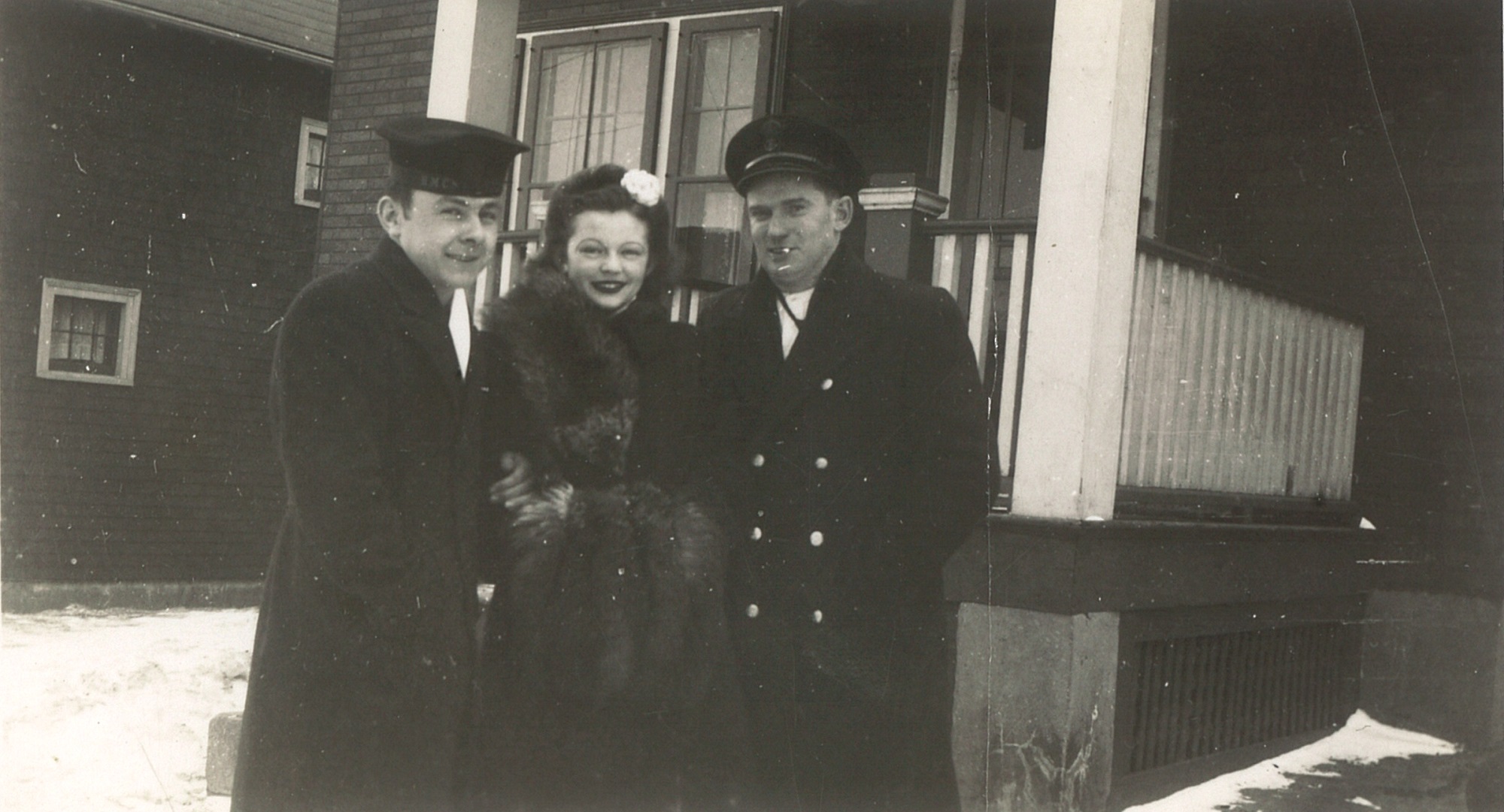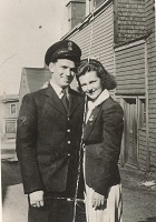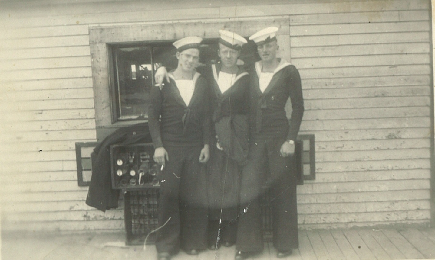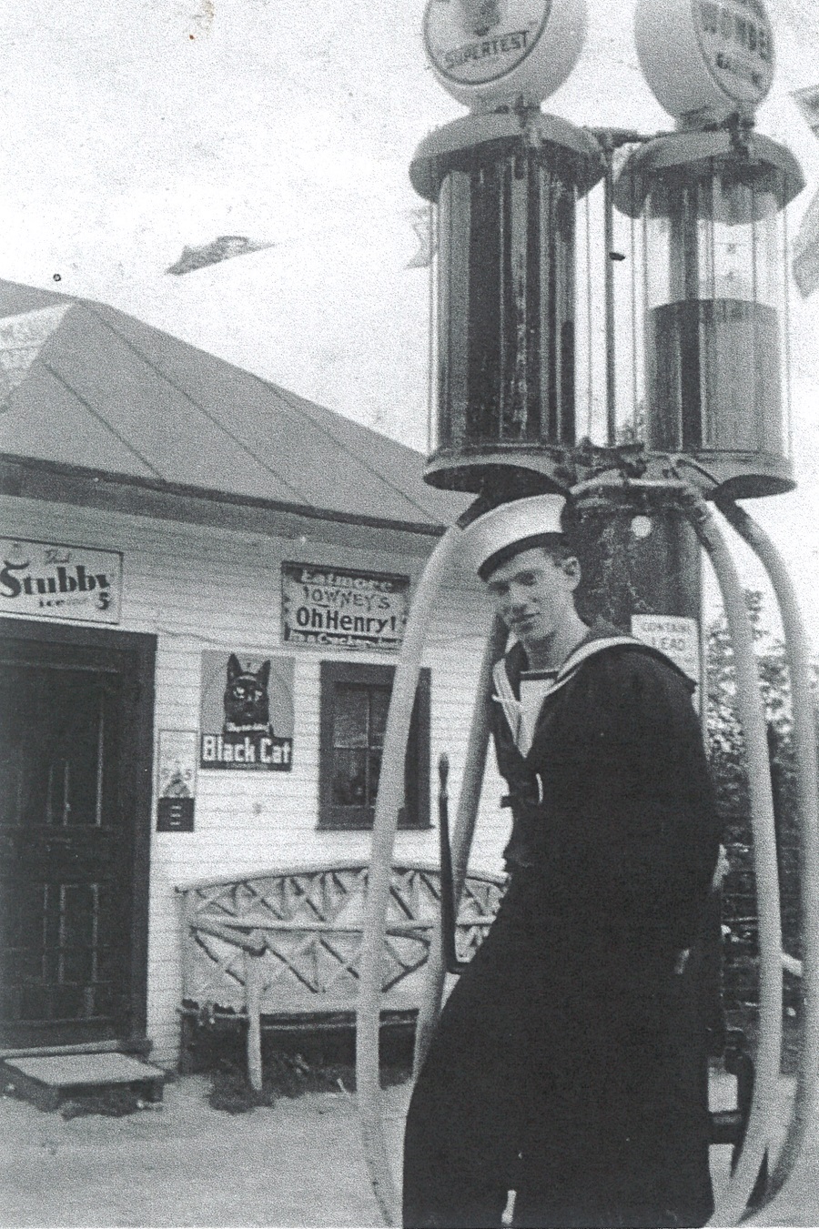 (CC17) Claude Campbell by the Supertest gas pump in front of general store owned by Ernie and Nettie Box in Village of White Lake - 1940 (CC18) Claude Campbell at the RCN Hospital Halifax - Claude 1st on left - remainder unknown (CC19) Seaman Torpedoman Claude Campbell (CC20) L-R: Geordie Cunningham, Luella and PO Claude Campbell (CC21) PO Claude Campbell and Luella Campbell in Halifax