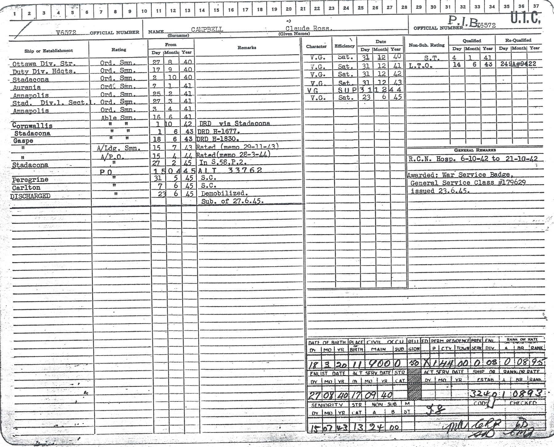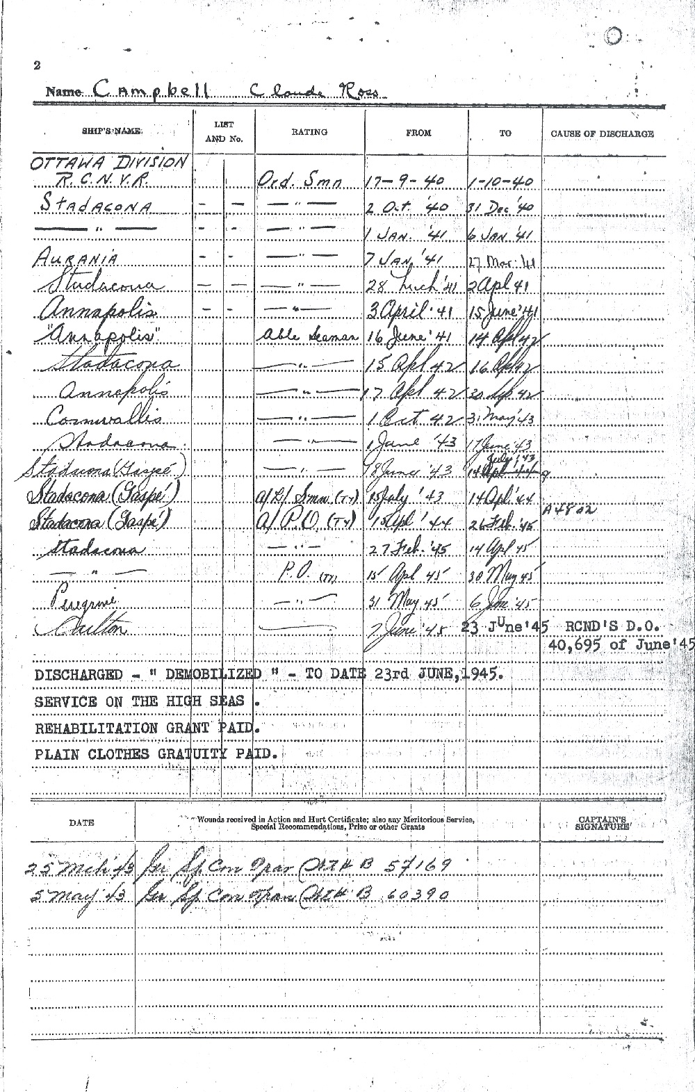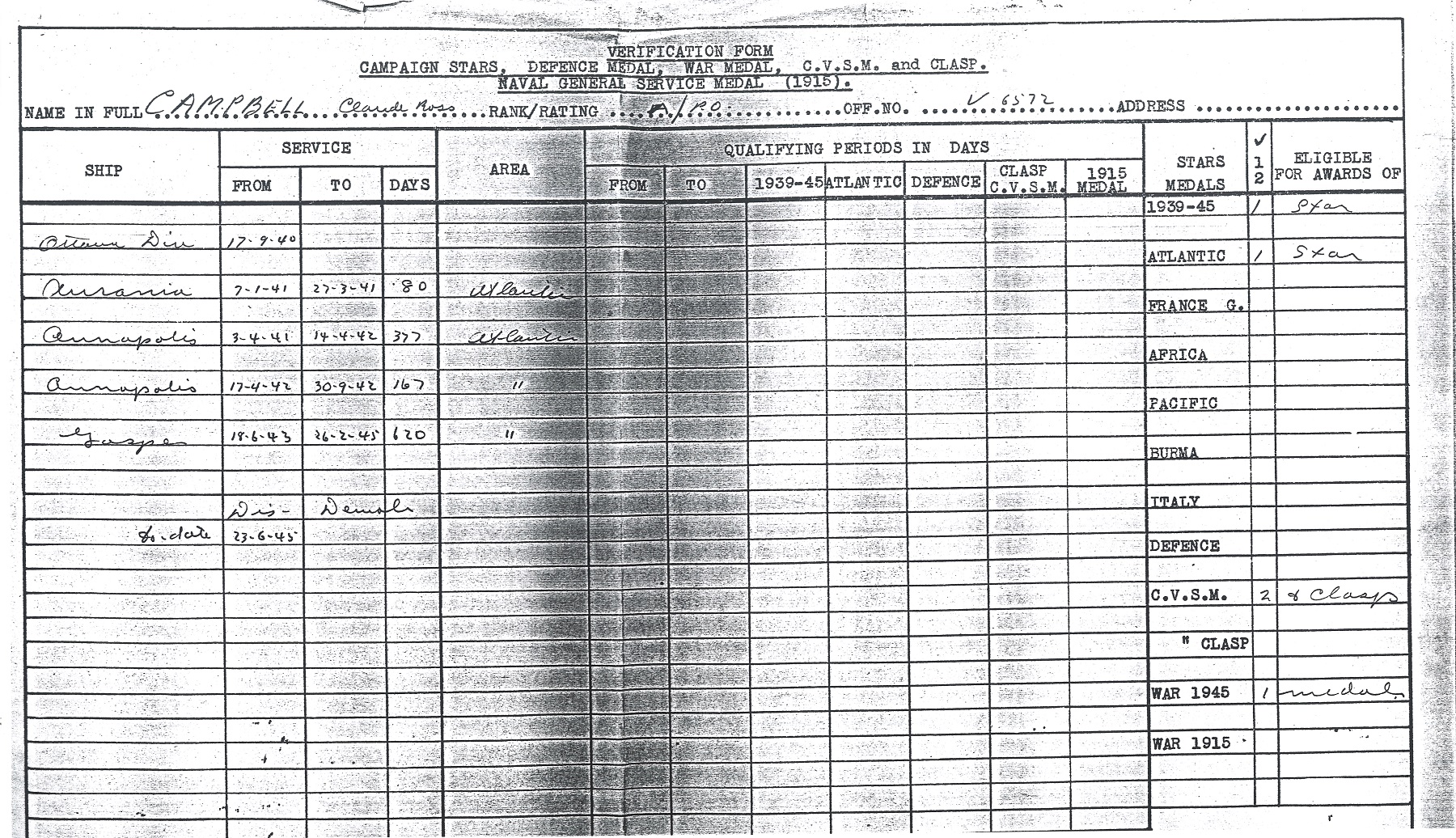 Ships served in: OTTAWA DIVISION RCNVR - Enlisted 17 Sep 1940 HMS AURANIA (Armed Merchant Cruiser) - Served in AURANIA 07 Jan 1941 - 24 Feb 1941 HMCS ANNAPOLIS - Served in Annapolis 24 Feb 1941 - 26 Mar 1941 HMCS ANNAPOLIS - Served in Annapolis 03 Apr 1941 - 30 Sep 1942 as an OS and AB, RCNVR. Rated AB 16 Jun 1941. AB Campbell was serving in Annapolis when she and HMS Witch provided assistance to convoy ON-127 in September 1942. HMCS GASPE - Served in Gaspe 18 Jun 1943 - 26 Feb 1945 an an AB, A/LS and A/PO, RCNVR. Rated A/LS 15 Jul 1943. Rated A/PO 15 Apr 1944 HMCS CARLETON - Served in Carleton 07 Jun 1945 - 23 Jun 1945 as a PO, RCNVR. Demobilized 23 Jun 1945