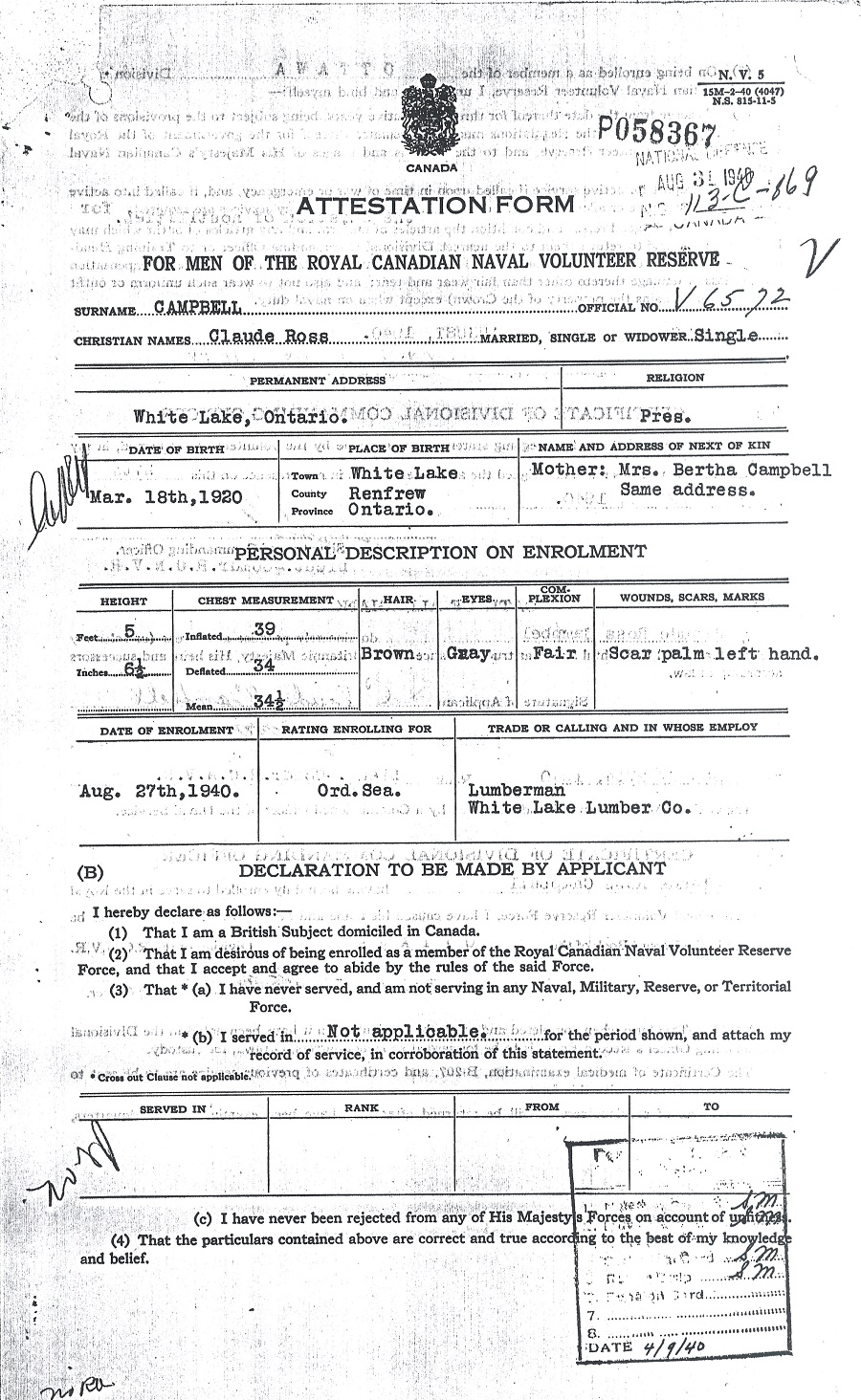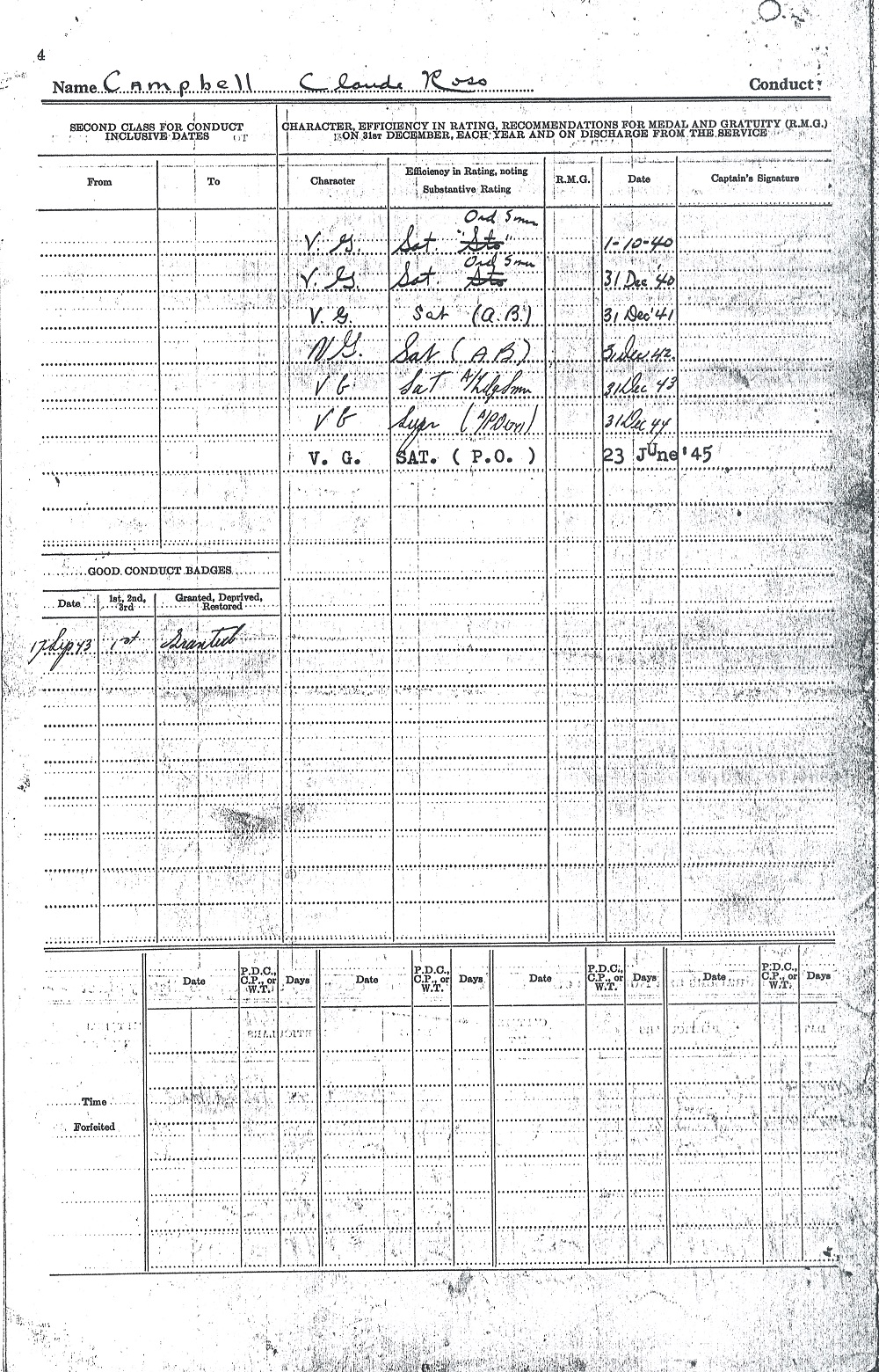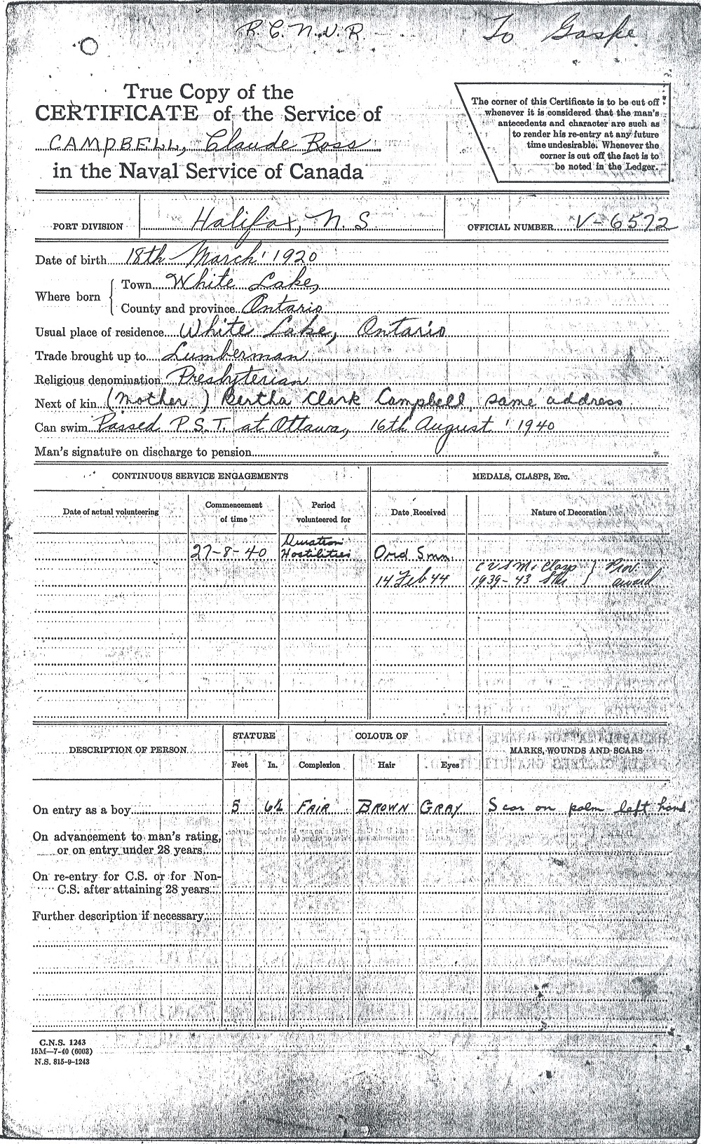 Ships served in: OTTAWA DIVISION RCNVR - Enlisted 17 Sep 1940 HMS AURANIA (Armed Merchant Cruiser) - Served in AURANIA 07 Jan 1941 - 24 Feb 1941 HMCS ANNAPOLIS - Served in Annapolis 24 Feb 1941 - 26 Mar 1941 HMCS ANNAPOLIS - Served in Annapolis 03 Apr 1941 - 30 Sep 1942 as an OS and AB, RCNVR. Rated AB 16 Jun 1941. AB Campbell was serving in Annapolis when she and HMS Witch provided assistance to convoy ON-127 in September 1942. HMCS GASPE - Served in Gaspe 18 Jun 1943 - 26 Feb 1945 an an AB, A/LS and A/PO, RCNVR. Rated A/LS 15 Jul 1943. Rated A/PO 15 Apr 1944 HMCS CARLETON - Served in Carleton 07 Jun 1945 - 23 Jun 1945 as a PO, RCNVR. Demobilized 23 Jun 1945