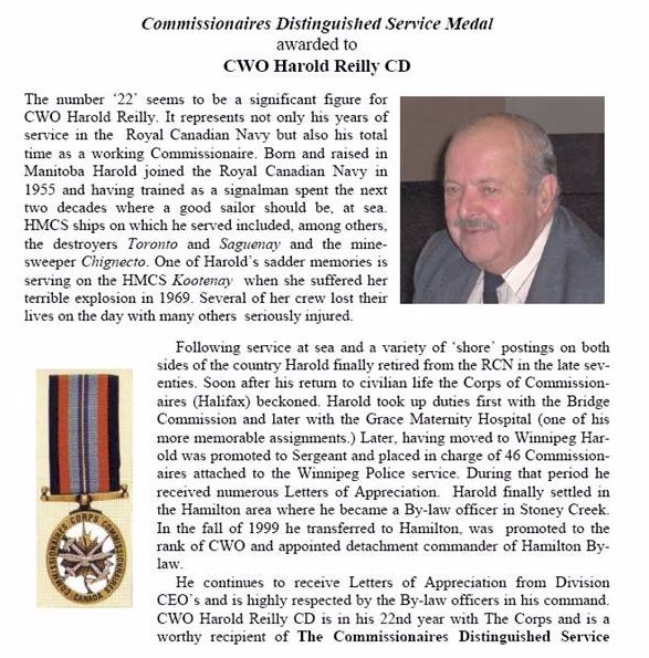 REILLY, Harold - Harold was with the Hamilton Division of the Canadian Corps of Commissionaires for a total of 20 years all of them in By-law first in Stoney Creek then becoming the Detachment Commander for Hamilton By-law in 1999. Prior to Hamilton he was with the Commissionaires in both Manitoba and Nova Scotia serving a total of 32 years. Harold served in the RCN for 22 years as a signalman. He served in HMCS CHIGNECTO, HMCS SAGUENAY, HMCS KOOTENAY and HMCS TORONTO. Harold passed away on May 23, 2018. (Corps of Commissionaires, Last Post)
