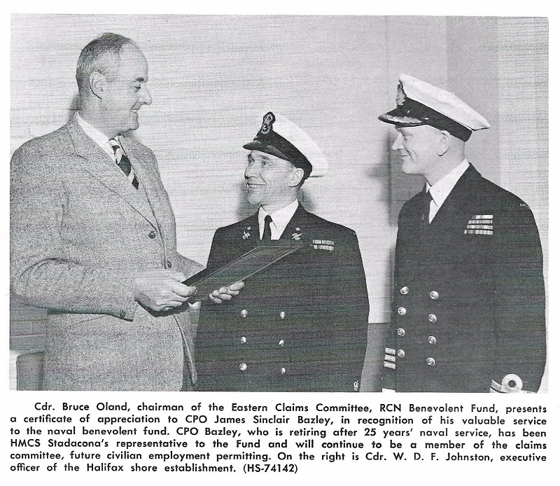 BAZLEY, James Sinclair - 88, Dartmouth, passed away in Dartmouth General Hospital on December 28, 2006. Born in Halifax, he was a son of the late James and Mary (Weaver) Bazley. James is survived by his wife, Connie (Smith); brother, Bruce (Jessie); nephew, Ian Bazley, all of Kelowna, B.C. He was predeceased by his first wife, Mary (Martell) Bazley; sister, Geraldine Fanais. He was a member of the Atlantic Chiefs and Petty Officers Association. He retired after 25 years in the Royal Canadian Navy and 17 years with the Federal Civil Service. Cremation has taken place under the direction of Atlantic Funeral Home, 771 Main St., Dartmouth, where visitation for family and friends will be held Tuesday, January 2, from 2-4, 7-9 p.m. Memorial service will be Wednesday at 11 a.m. in Anglican Church of the Holy Spirt (corner of Regency Drive and Gaston Road), Dartmouth, Rev. Edwin Ebsary officiating. Reception to follow. Burial in Gate of Heaven Cemetery, Lower Sackville. In lieu of flowers, donations in memory of James can be made to the Goodfellows, Salvation Army or charity of choice. (Halifax Chronicle-Herald 30 Dec 2006)