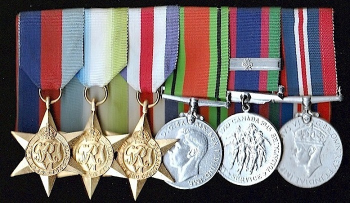 The 1939-1945 Star, the Atlantic Star, the France and Germany Star, the Defence Medal, the Canadian Volunteer Service Medal and Clasp, the 1939-1945 War Medal
