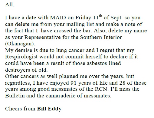 Bill's letter to the members of the Chief and Petty Officer's Association (Esquimalt) Published in the Sep 2020 association newsletter