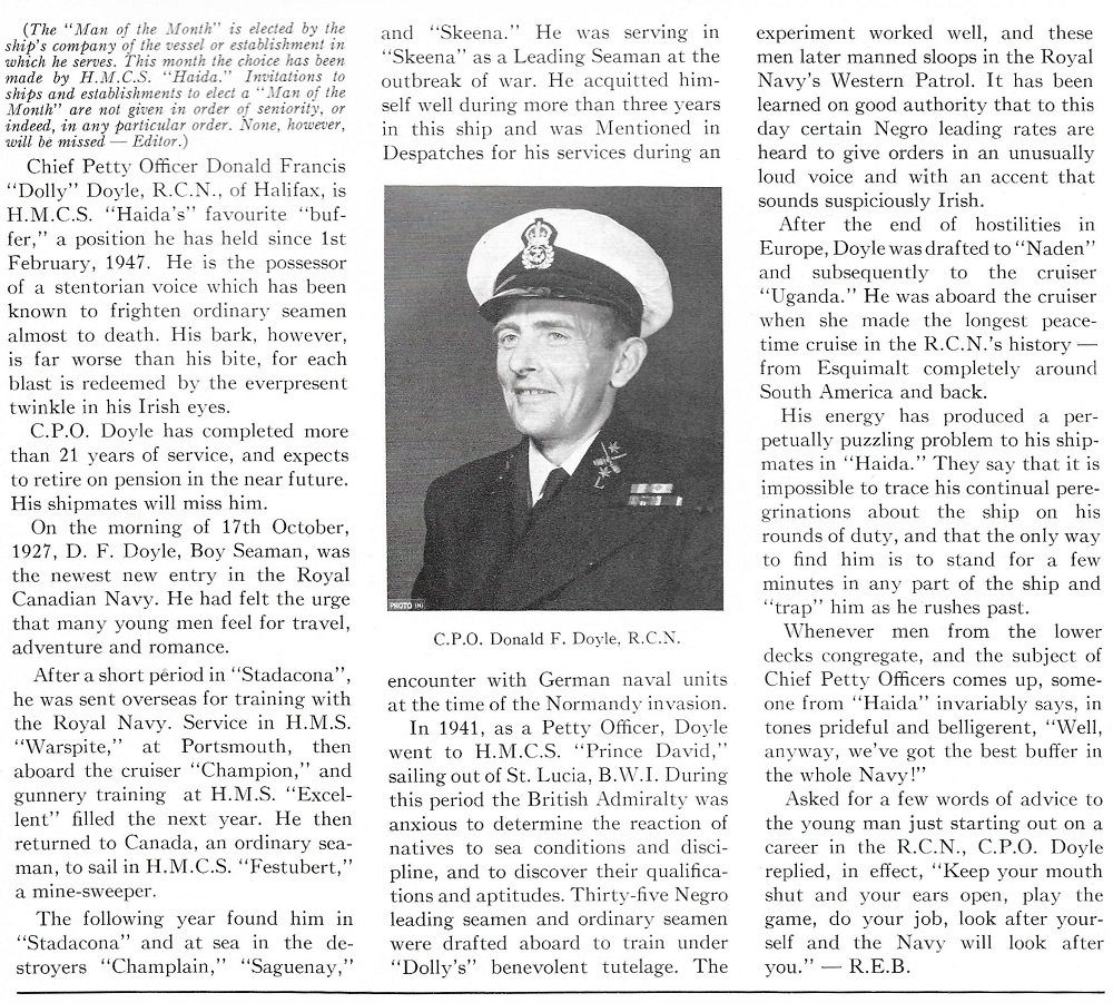 Mentioned in Despatches citation: DOYLE, Donald Francis, Chief Petty Officer, 2204, Mention in Despatches, RCN, HMCS SKEENA - Awarded as per Canada Gazette of 20 January 1945 and London Gazette of 3 October 1944.Home: Halifax, Nova Scotia. "For outstanding leadership, skill and devotion to duty in H.M. Canadian Ships QU'APPELLE, SKEENA, SASKATCHEWAN and RESTIGOUCHE in a successful action with enemy trawlers and U-boats."
