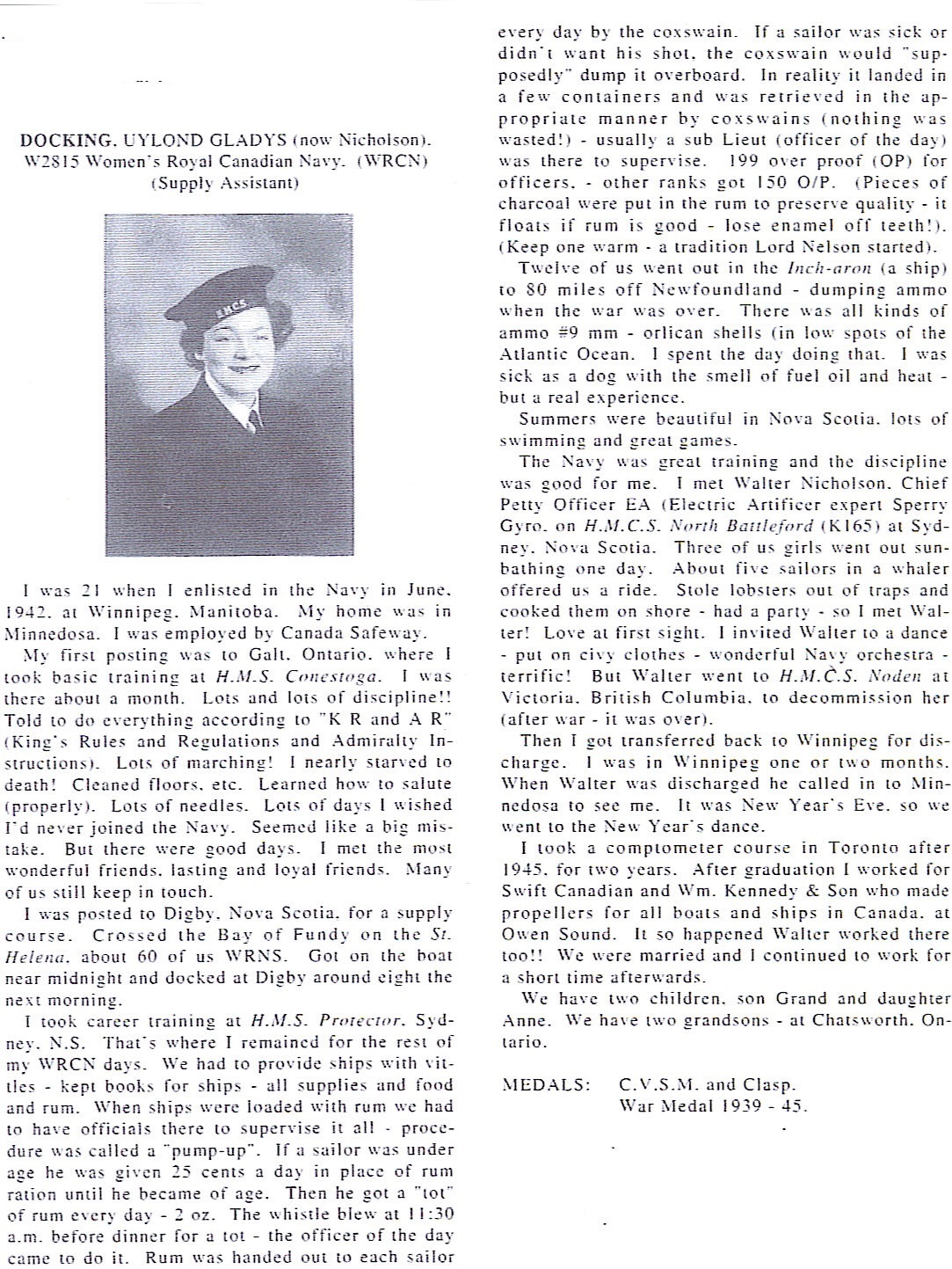 NICHOLSON, Uylond Gladys (née DOCKING) - Enlisted in the WRCNS at the are of 21 in June 1942 at Winnipeg, MB as a Supply Assistant.