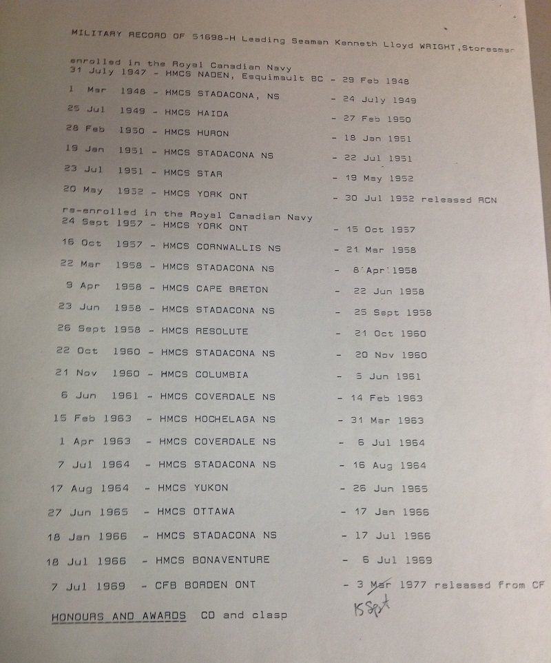 Ships served in: HMCS HAIDA - Served in Haida 25 Jul 1949 - 27 Feb 1950 HMCS HURON - Served in Huron 28 Feb 1950 to 18 Jan 1951 HMCS CAPE BRETON - Served in Cape Breton 09 Apr 1958 - 22 Jun 1958 HMCS RESOLUTE - Served in Resolute 26 Sep 1958 - 21 Oct 1960 HMCS COLUMBIA - Served in Columbia 21 Nov 1960 - 05 Jun 1961 HMCS YUKON - Served in Yukon 17 Aug 1964 - 26 Jun 1965 HMCS OTTAWA - Served in Ottawa 27 Jun 1965 to 17 Jan 1966 HMCS BONAVENTURE - Served in Bonaventure 18 Jul 1966 - 06 Jul 1969