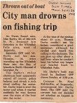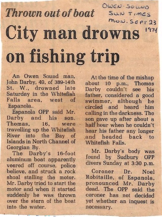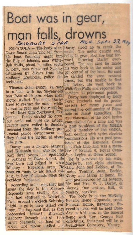 DARBY, John Flockhart - aged 49 of Owen Sound, formerly of Espanola. Passed away at Whitefish Falls, Saturday, Sept. 21, 1974. Beloved husband of Marjorie (Wilson). Dear father of Gail, John and Debbie of Toronto, Tom, Joan, Beckie, Kathy and Marni, all at home in Owen Sound. Dear brother of Bill Darby, Massey. Predeceased by his parents, Mr. and Mrs. W.J. Darby. A member of the Royal Canadian Legion, Branch 6, Owen Sound. Past president of N.M.E.A. Past chairman of the Espanola Hydro and member of the O.M.E.A. Past club master of the Espanola Game and Fish. Resting at the McNally Funeral Home, 222 Spruce St., Espanola, Monday from 2 p.m. till 5 p.m. and 7 p.m. to 10 p.m. Funeral service will be held September 24th at 8:30a.m. from McNally Funeral Home with Rev. George Bell officiating. Interment in Massey Grandview Cemetery.