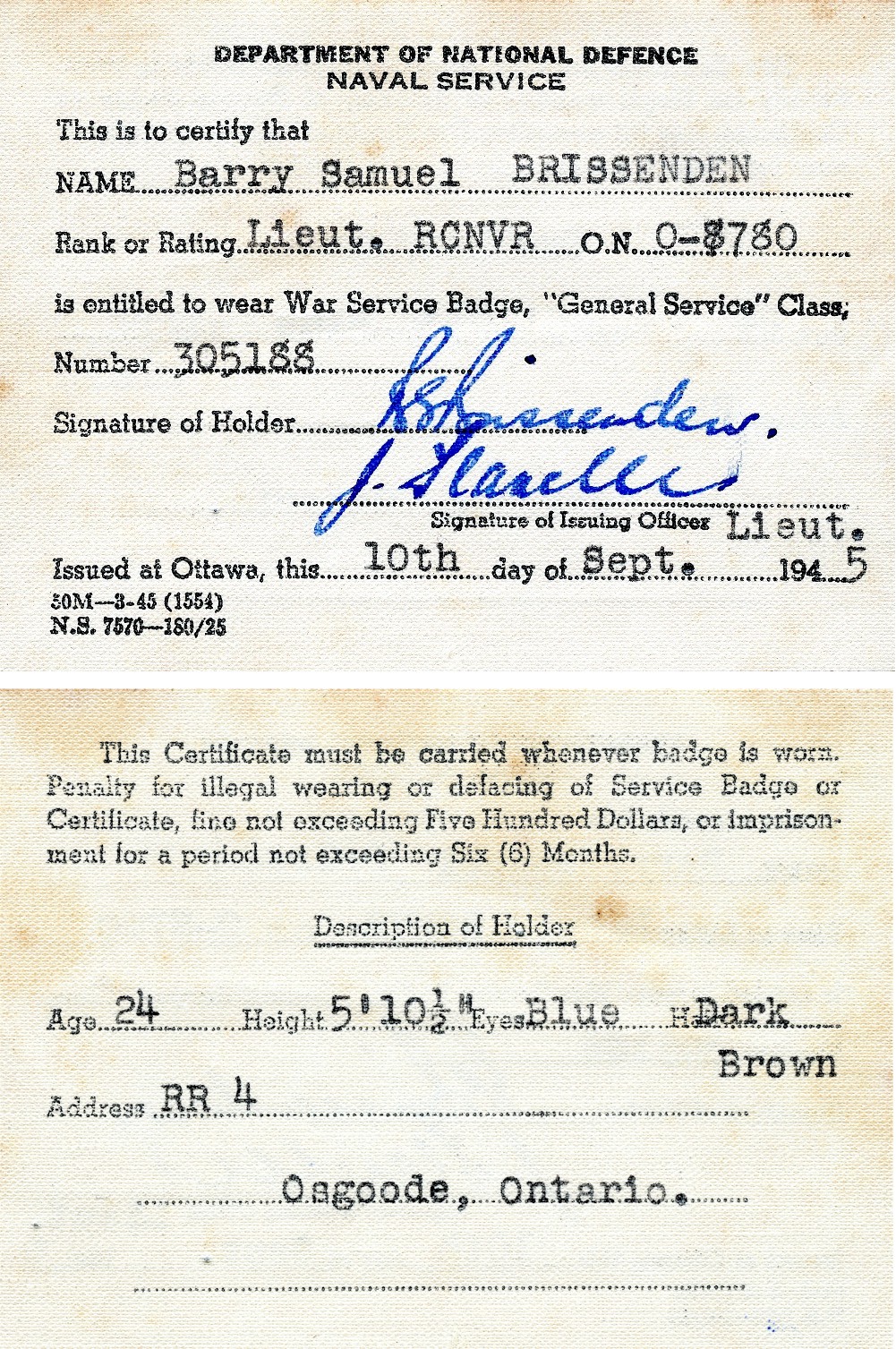 Ships served in: HMCS ROYAL ROADS - Appointed to Royal Roads 26 Jan 1941 as a Prob. SLt, RCNVR (Navy List Feb 1941) HMCS SANS PEUR - Appointed to Sans Peur 26 May 1941 as a SLt, RCNVR (Navy List Jul 1941) Seniority 01 Jan 1941 (Navy List Jul 1941) HMCS MALPEQUE - Appointed to Malpeque 04 Aug 1941 as a SLt, RCNVR (Navy List Aug 1941) HMCS WINNIPEG - Appointed to Winnipeg 22 Jul 1943 as a Lt, RCNVR (seniority 01 Jan 1943) (Navy List Aug 1943). Appointed as Lt (n), RCNVR (Navy List Oct 1943) HMCS BADDECK - Appointed to Baddeck 01 Mar 1944 as a Lt (n), RCNVR (seniority 01 Jan 1942) (Navy List Jul 1944) * Retired List - as a Lt, RCN(R) (seniority 01 Jan 1942) (Navy List Apr 1946) HMCS CATARAQUI - Appointed to Cataraqui 07 Feb 1949 as a Lt, RCN(R) (Navy List Jul 1949). HMCS BYTOWN - Appointed to Bytown, For Special Services, NMCS Washington, USA, Add'l for Courses 11 Jun 1951 as a Constructor Lieutenant, RCN (SSA) (Navy List Jul 1951). HMCS NIAGARA - Appointed to Niagara 07 Sep 1951 as a Constr. Lt, RCN (seniority 18 Oct 1947) (Navy List Jul 1952) NAVAL SERVICE HEADQUARTERS OTTAWA - Appointed to NSHQ Ottawa, On Staff of Principal Overseerer Sorel Area 12 Jul 1954 as a Con. Lt, RCN (Navy List Oct 1954). NAVAL SERVICE HEADQUARTERS OTTAWA - Appointed to NSHQ Ottawa, On Staff of Naval Constructor-in-Chief as a Con. LCdr, RCN (seniority 18 Oct 1955) (Navy List Jul 1956). Appointed Staff Officer, Carriers and Cruisers as a Con. LCdr, RCN (Navy List Jan 1958) * Honourably Released 01 Jun 1959 as a Con. LCdr, RCN (Navy List Jul 1959)