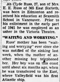 Clyde Russ married in 1946. He had 2 daughters. He is buried in the Mountain View Cemetery, Vancouver, BC.
