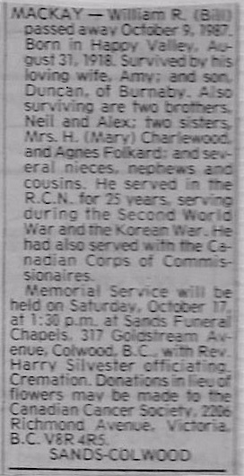 Died: 09 Oct 1987, Happy Valley, British Columbia