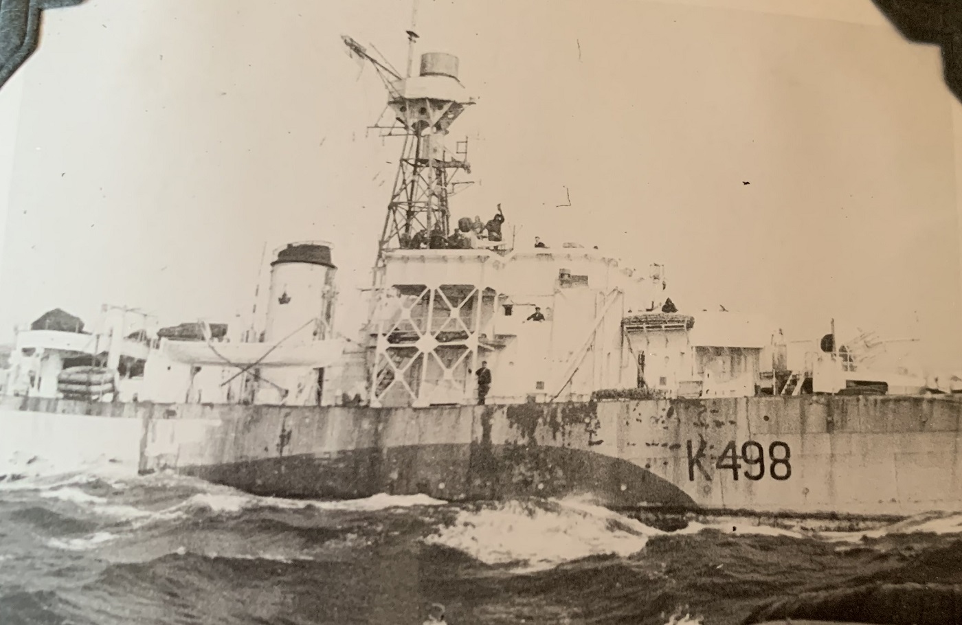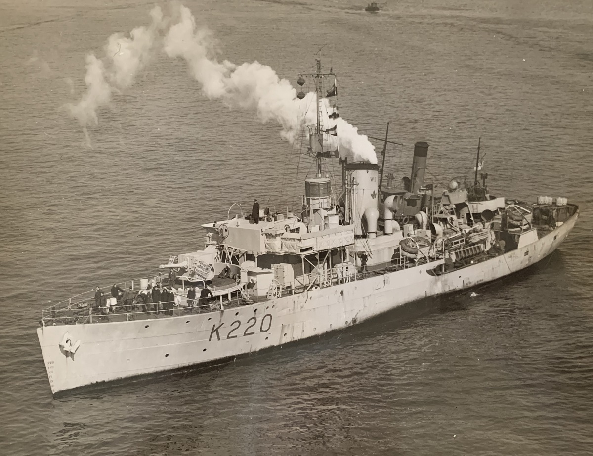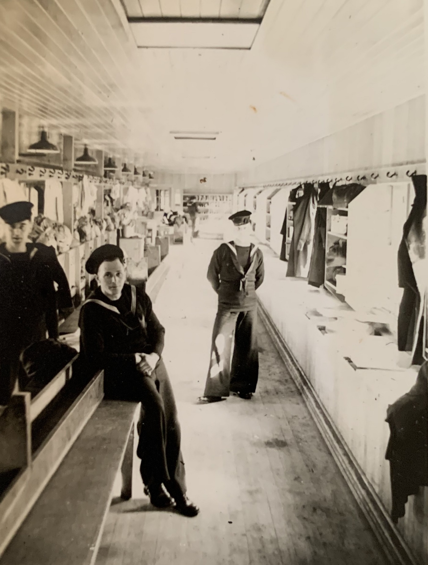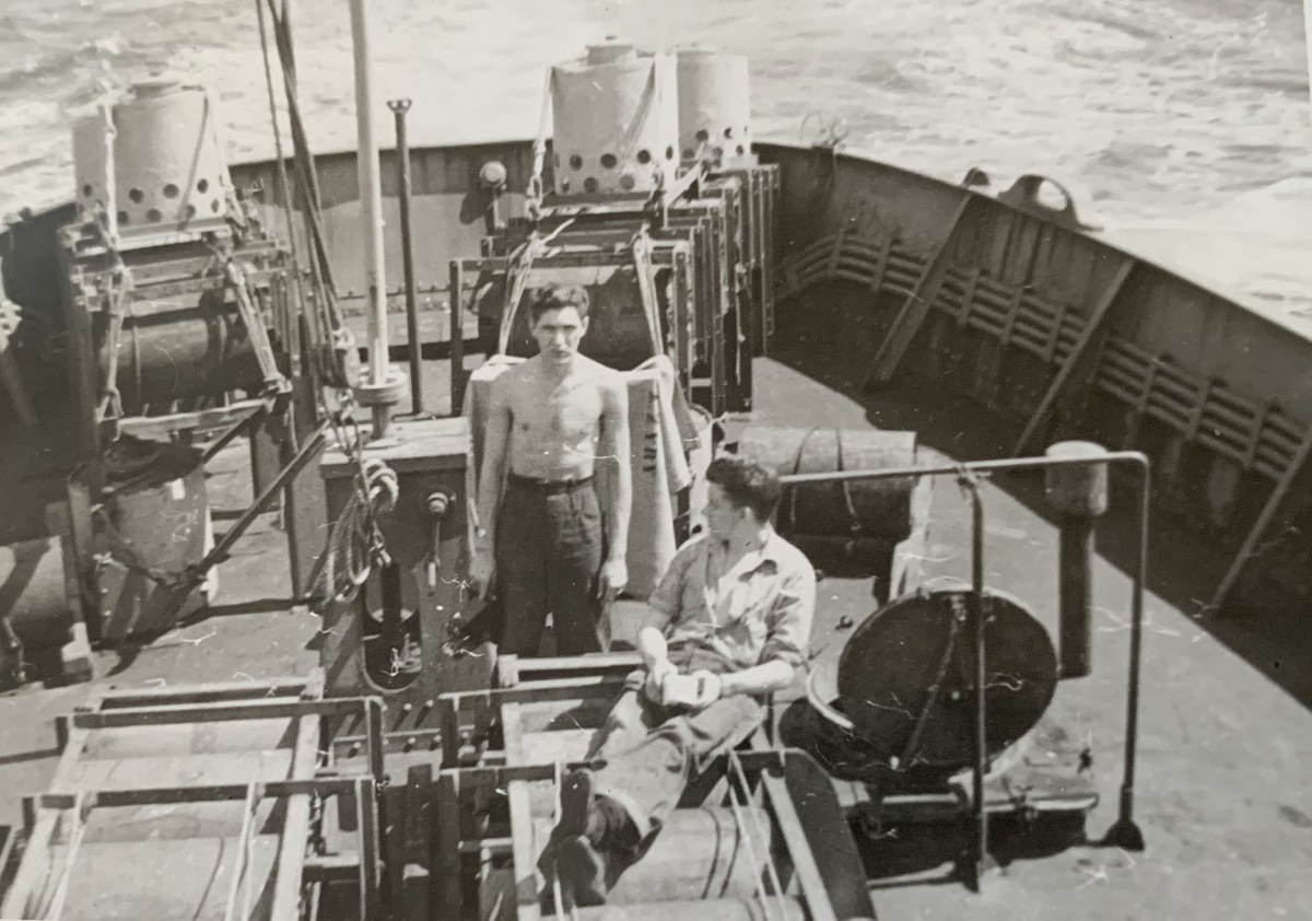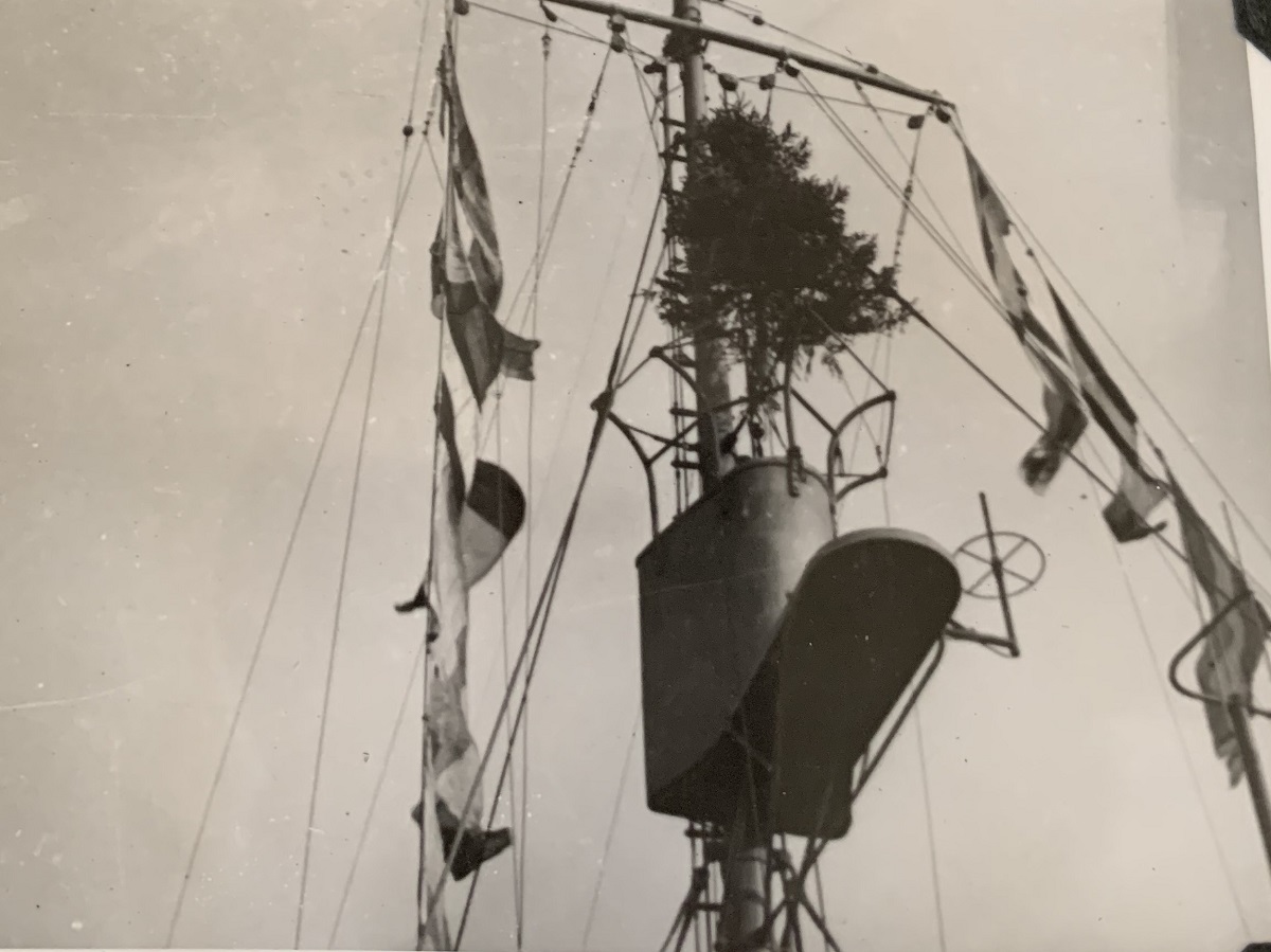 (GM12) HMCS MIDLAND K220 (GM13-GM14) A Christmas tree hoisted up the mast on HMCS MIDLAND K222 - Christmas 1944 (GM15) Ken Travena on the quarterdeck of HMCS MIDLAND K220 (GM16) Bill Moore (left) and Bob Lower (centre) in a mess deck on HMCS MIDLAND K220