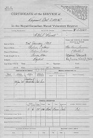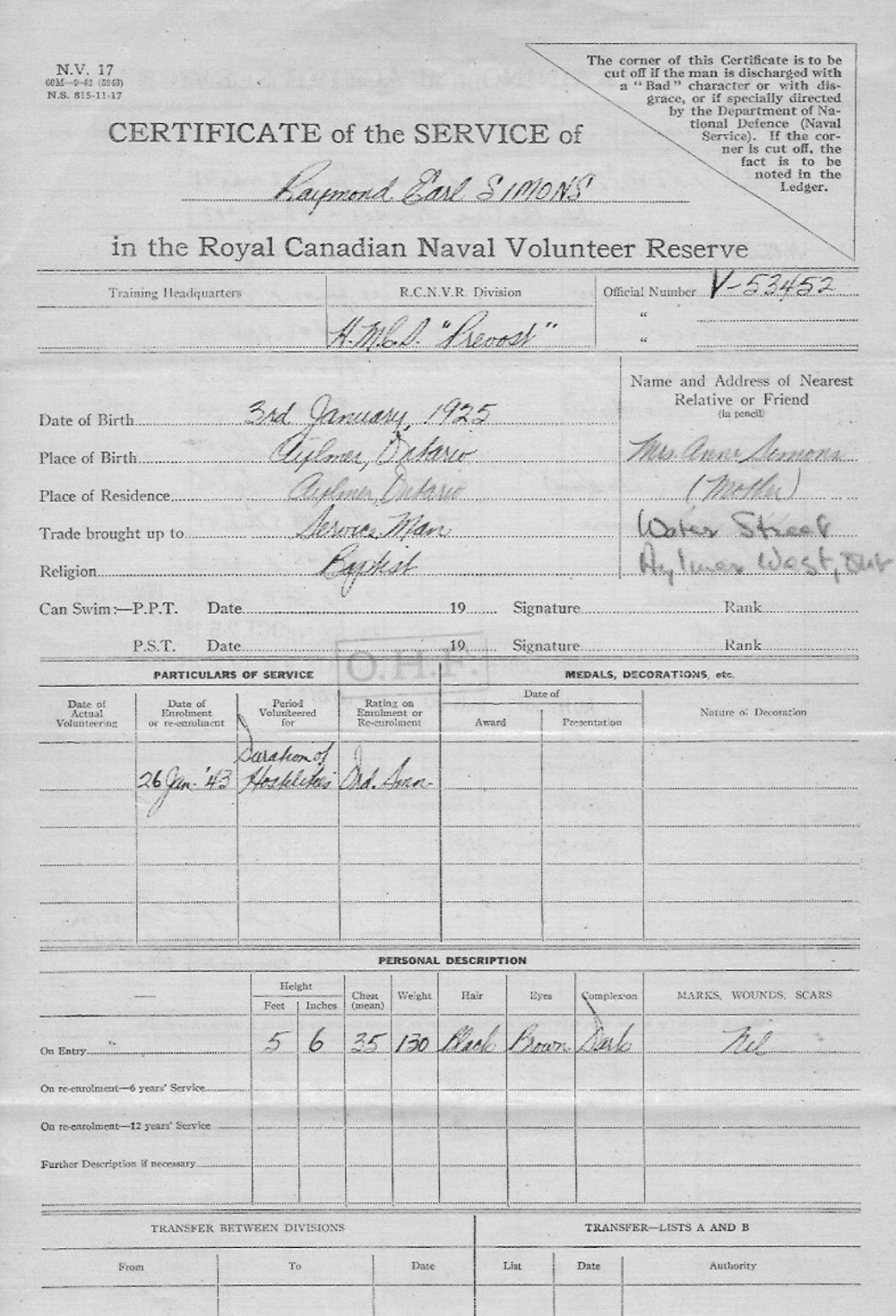 Ships served in: HMCS PREVOST - Enlisted 26 Jan 1943. Commenced Active Service 03 May 1943 HMCS CHAUDIERE - Served in Chaudiere 16 Apr 1944 - 30 Apr 1945 an an OS and AB, RCNVR. Rated AB 03 May 1944 HMCS SCOTIAN - Served in Scotian - 06 Mar 1945 - 06 Sep 1945 HMCS PREVOST - Served in Prevost - 12 Sep 1945 - 25 Oct 1945. Demobilized 25 Oct 1945