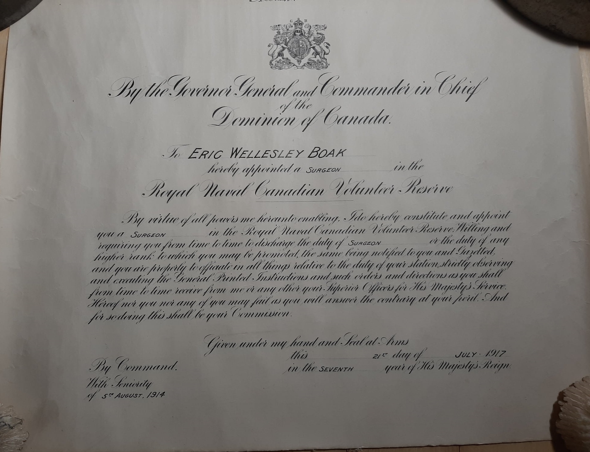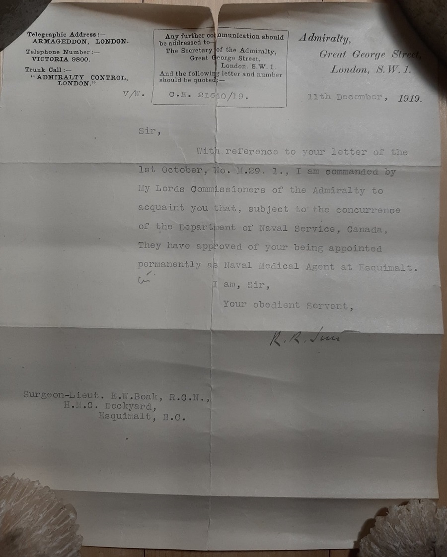 Eric Boak's appointment as Naval Medical Agent at Esquimalt Courtesy of Iain Glas Click on the above photo to view a larger image