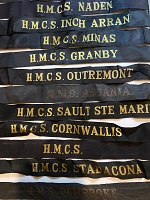 (RW01) Re-creation of HMCS DRUMHELLER"S gunshield art based on the post Second World War style of badges for the RCN (RW02) Bob Winchester collection RCN cap tallies. These are a few of the tallies in Bob's collection.