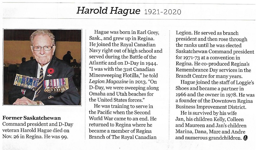 HAGUE, Harold - was born in Earl Grey, SK and grew up in Regina. He signed up for the active service in the Royal Canadian Navy after high school and served during the Battle of the Atlantic and on D-Day. Following WW2, Harold joined the staff at Loggie’s Shoes where he became a partner in 1966 and owner in 1978. Instrumental in the development of Regina’s downtown, Harold was a founder of the Regina Downtown Business Improvement District (RDBID) in 1981. He also played a leading role in the establishment of the Douglas Park Track and Field facility and the YWCA. Harold’s volunteerism included serving on the boards of the Chamber of Commerce, the Canadian Cancer Society, the Queen City Kinsmen as well as serving as President/Chair of the Family Service Bureau, Wascana Winter Club, Regina Exhibition Association, RDBID, The Royal Canadian Legion Regina Branch 001and the Saskatchewan Command and Corps of Commissionaires. He also co-produced the Remembrance Day Service at the Brandt Centre for many years. Recognized for his service to the community and country, Harold received the Legion’s Meritorious Medal, the Commissionaire’s Distinguished Service Medal, the Ministry of Veterans Affairs Commendation Award, the Caring Canadian Award, the Lieutenant Governor’s Military Service Medal, the Chamber of Commerce Paragon award for lifetime achievement and the highest honour from France, the rank of Knight of the National Order of Legion. Harold was predeceased by his parents, Albert and Gladys Hague. He is survived by his wife Jan; his children Kelly, Colleen and Maureen; Jan’s children Marina, Dana, Marc and Andre; and numerous grandchildren. Harold will be remembered for his kindness, generosity, friendship and service in our community. There will be no service at this time due to COVID-19. Any donations could be made in Harold’s name to the Royal Canadian Legion Regina Branch 001, 1820 Cornwall Street, Regina, SK S4P 2K2.