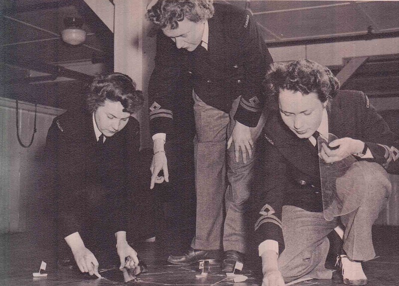 Officers and ratings of the WRCNS plotting positions on the tactical table, Halifax, 1944. Lt Carole Hendry (kneeling, on right) (Source: The Memory Project)