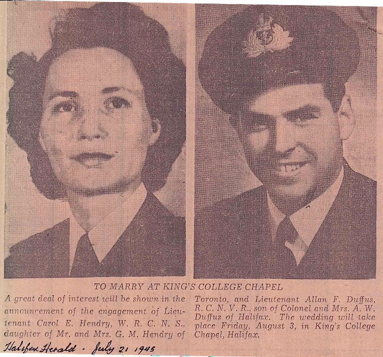 Wedding announcement for Carole E. Hendry, WRCNS to Allan F. Duffus, RCNVR Halifax Herald 21 Jul 1945 (Source: The Memory Project)