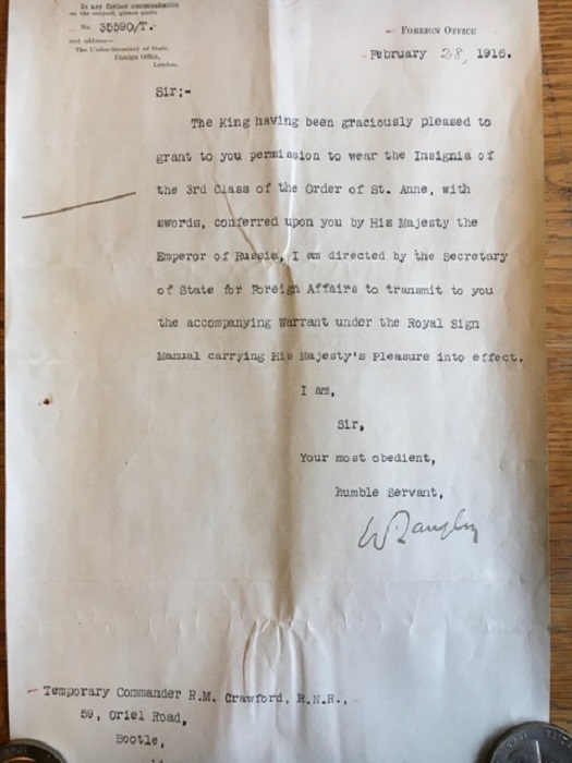 (RC01) Passport photo (RC02) Russian Passport (RC03) The 1914-15 Star (RC04) Order of St. Anne 3rd Class (RC05) Letter granting Cdr (temp) Reginald Crawford the Order of St. Anne 3rd Class