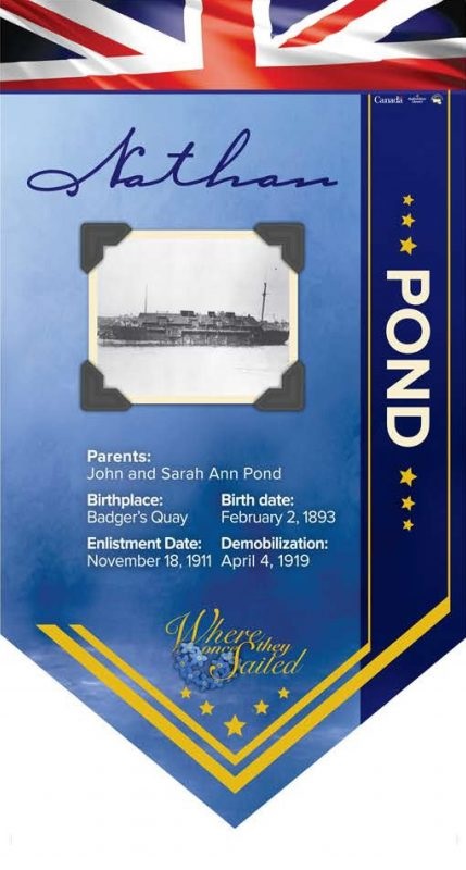 POND, Nathaniel (Nathan) - was born on February 2, 1893 to John and Sarah Pond at Badger Quay, Bonavista Bay. He was raised and remained there until he enlisted with the Newfoundland Royal Naval Reserve on November 1911.