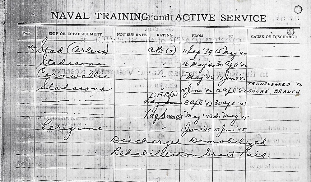 Ships served in: HMCS ARLEUX - Served in Arleux 11 Sep 1939 - 15 May 1940 as an AB, RCNR FPV CYGNUS (former HMCS MELVILLE) - Served in Cygnus in 1945