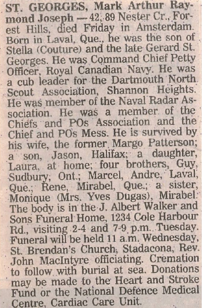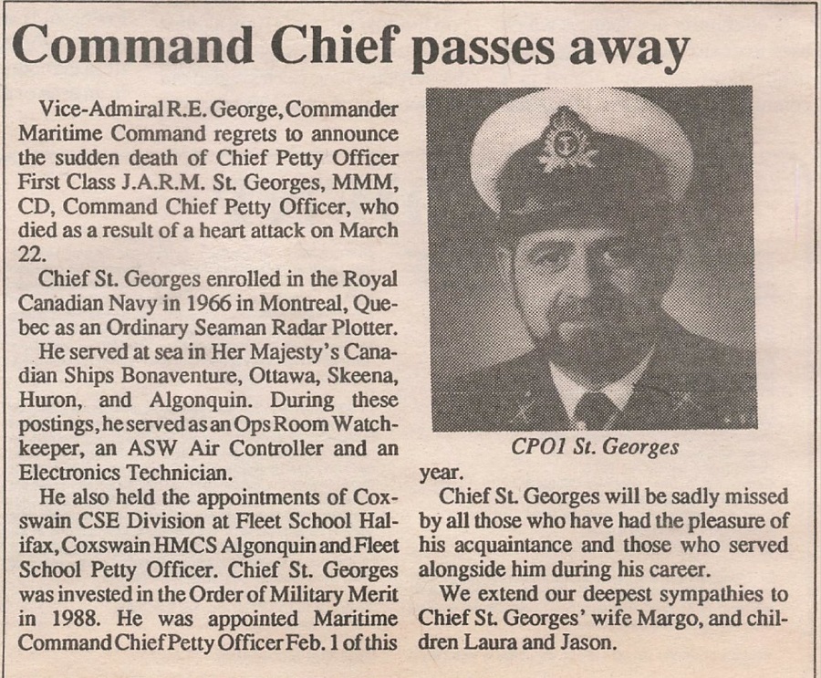 CPO1 Joseph Arthur Raymond Marc St-Georges was buried at sea 27 May 1991 from HMCS SKEENA.