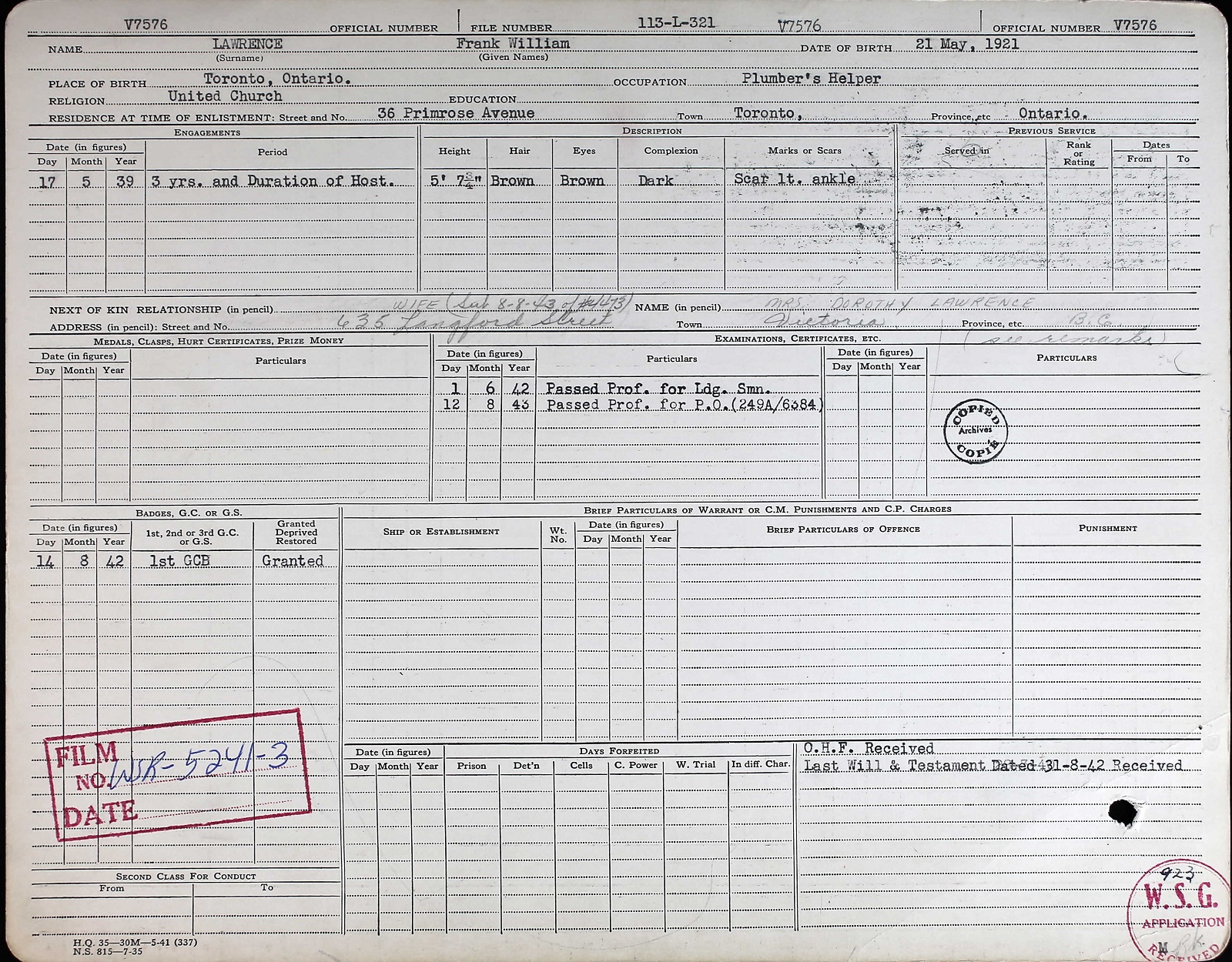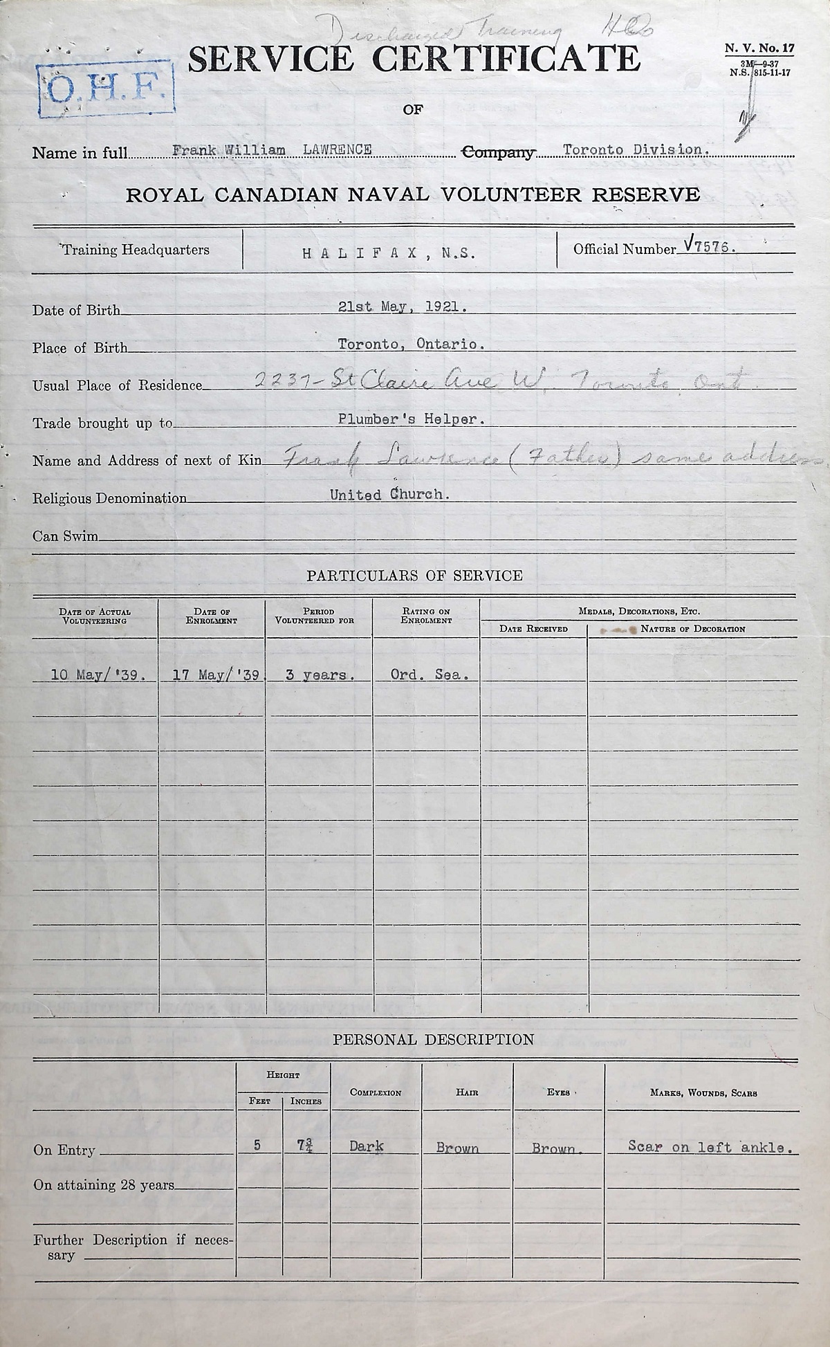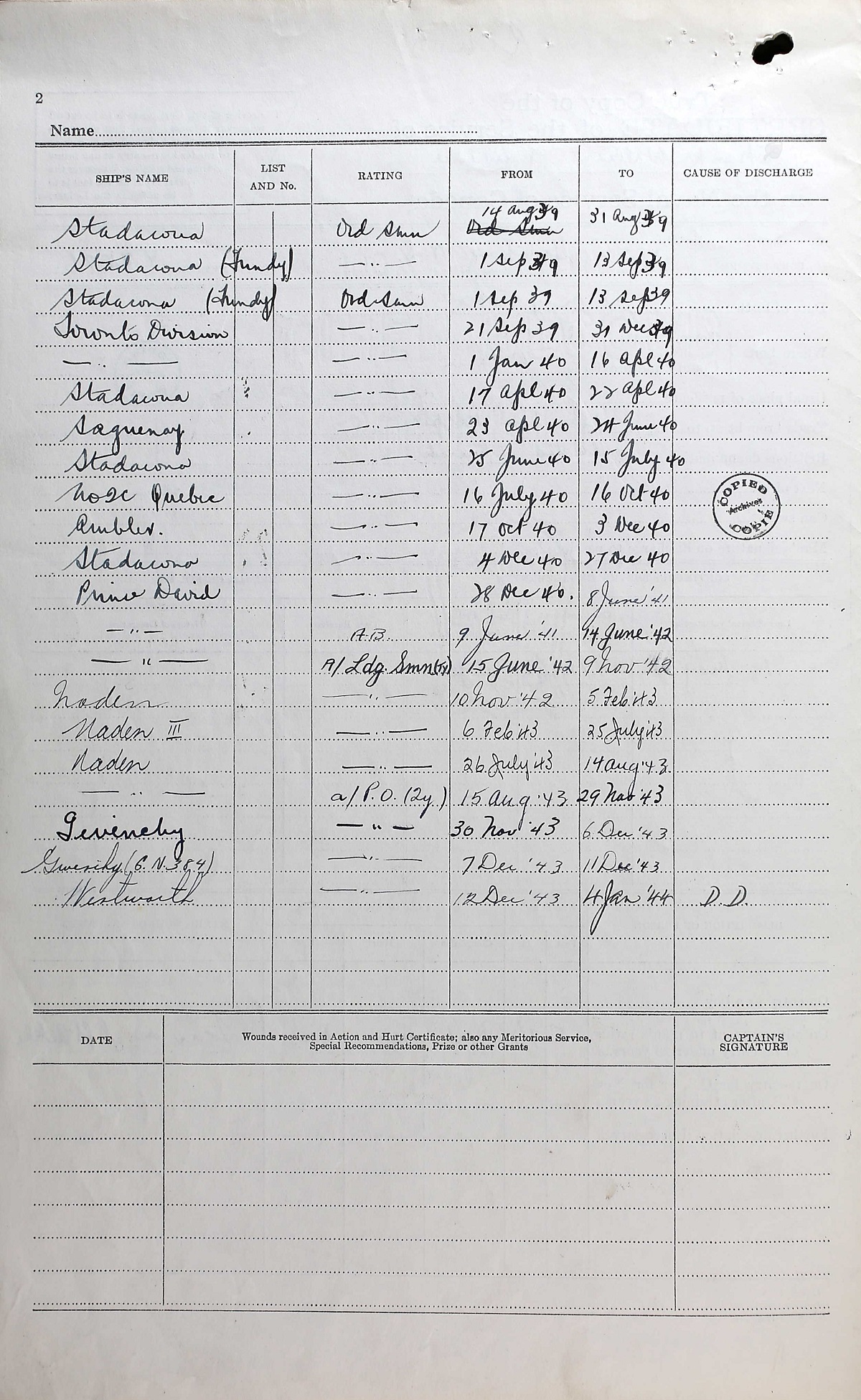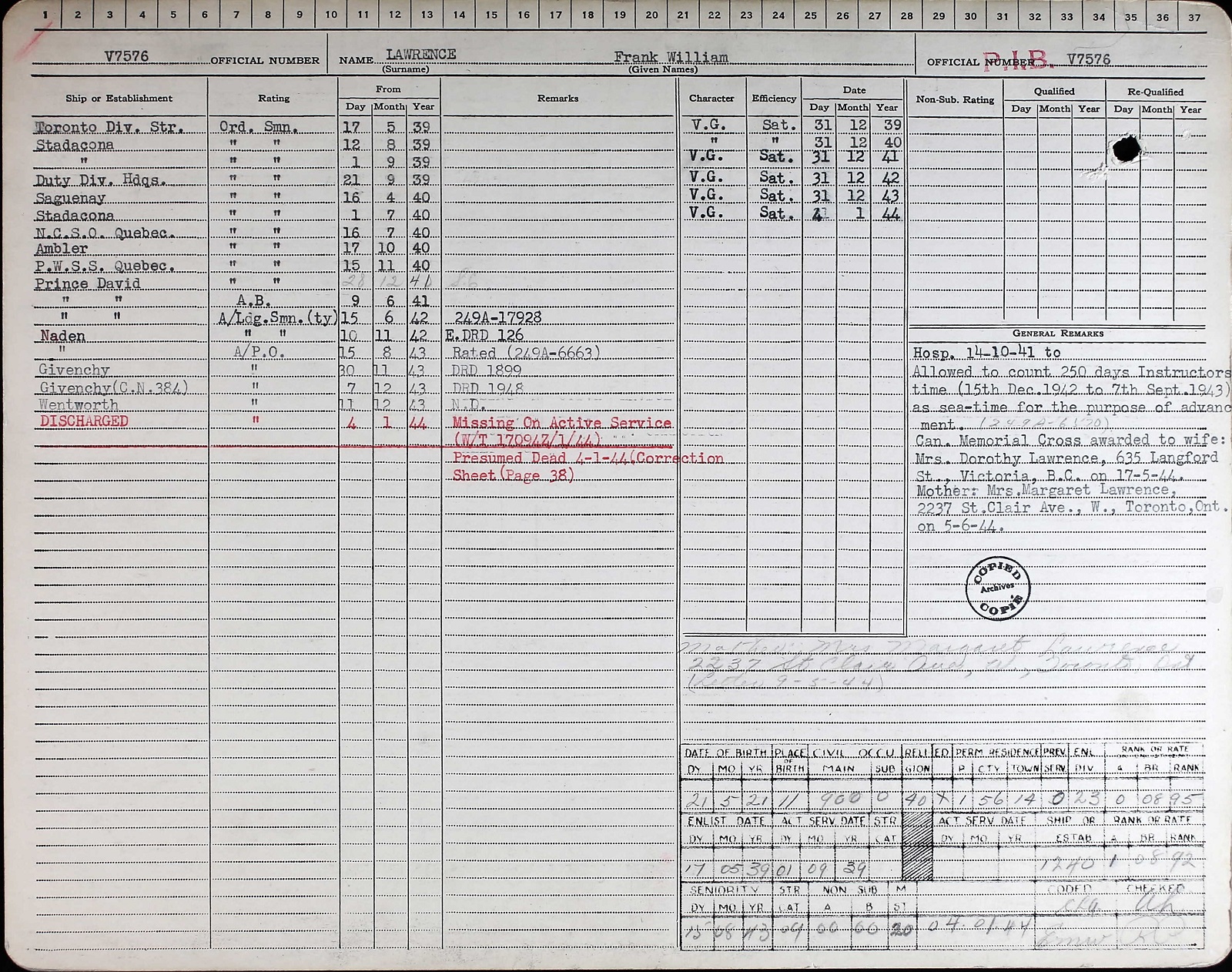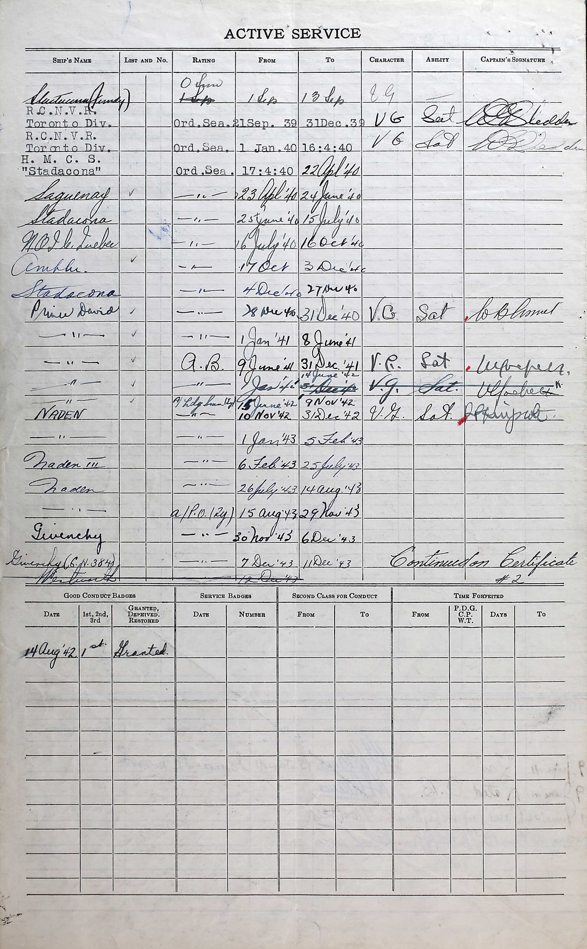 Ships served in: TORONTO DIVISION RCNVR - Enlisted 17 May 1930 HMCS FUNDY - Served in FUNDY 01 Sep 1939 - 13 Sep 1939 as an OS, RCNVR TORONTO DIVISION RCNVR - Served in TORONTO DIVISION RCNVR 21 Sep 1939 - 16 Apr 1940 HMCS SAGUENAY - Served in SAGUENAY 23 Apr 1940 - 24 Jun 1940 as an OS, RCNVR HMCS AMBLER - Served in AMBLER 17 Oct 1940 - 14 Nov 1940 as an OS, RCNVR PORT WAR SIGNAL STATION QUEBEC - Served in PWSS QUEBEC 15 Nov 1940 - 27 Dec 1940 as an OS, RCNVR HMCS PRINCE DAVID - Served in PRINCE DAVID 28 Dec 1940 - 09 Nov 1942 as an OS, AB and A/LS, RCNVR. Rated AB 09 Jun 1941. Rated A/LS 15 Jun 1942 HMCS GIVENCHY - Served in GIVENCHY 30 Nov 1943 - 11 Dec 1943 as an A/PO, RCNVR HMCS WENTWORTH - Drafted to WENTWORTH 12 Dec 1943 as an A/PO, RCNVR
