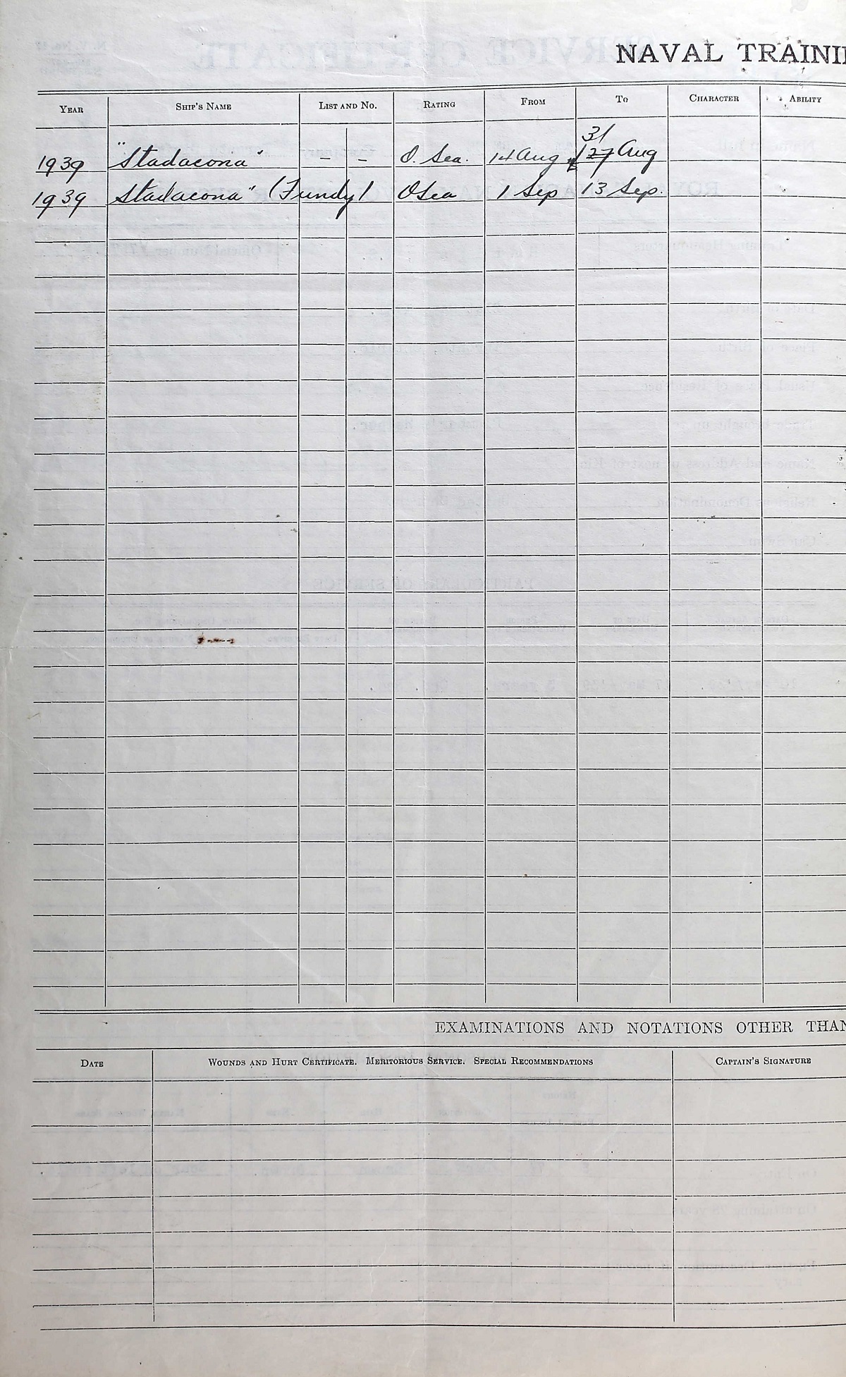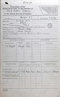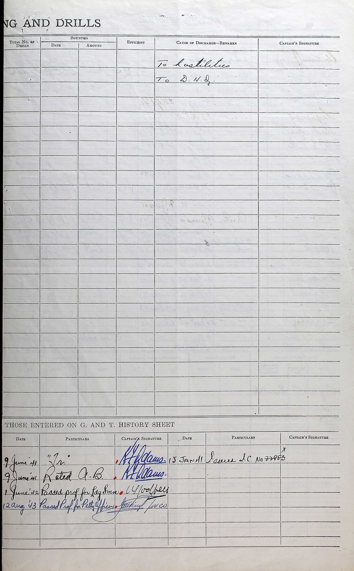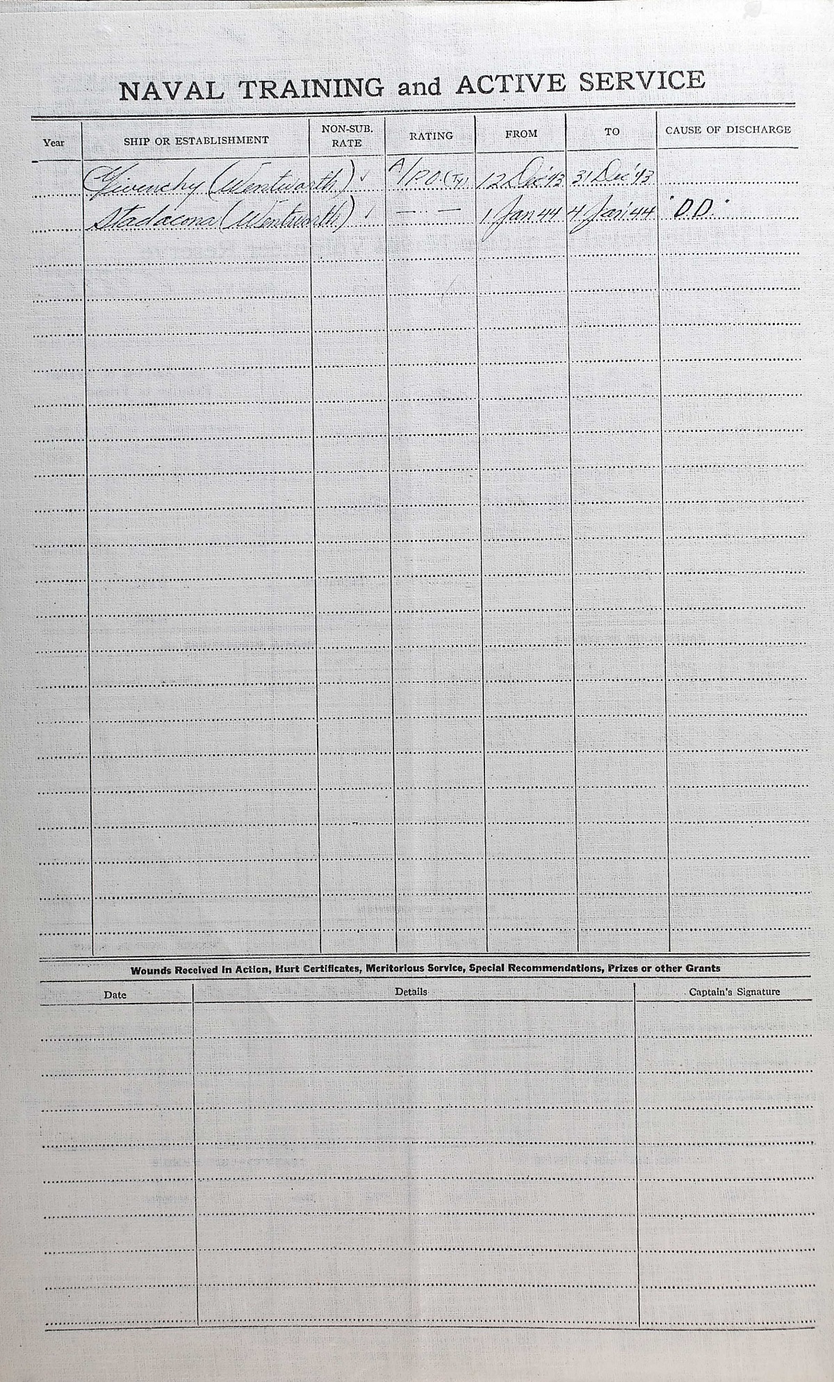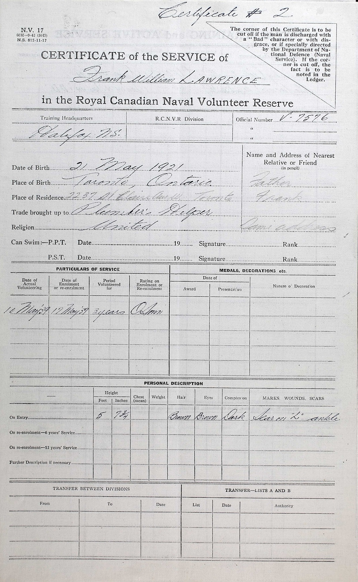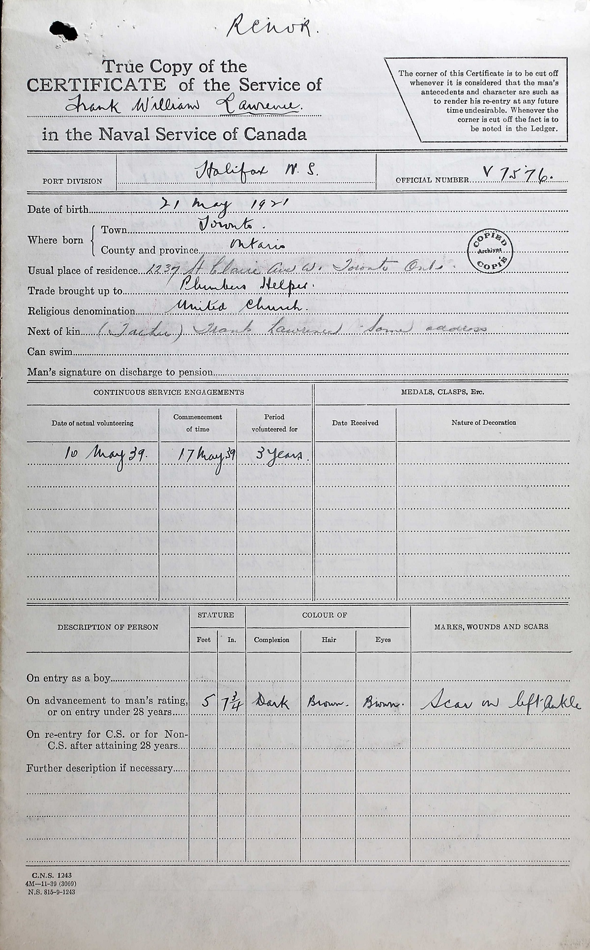 Ships served in: TORONTO DIVISION RCNVR - Enlisted 17 May 1930 HMCS FUNDY - Served in FUNDY 01 Sep 1939 - 13 Sep 1939 as an OS, RCNVR TORONTO DIVISION RCNVR - Served in TORONTO DIVISION RCNVR 21 Sep 1939 - 16 Apr 1940 HMCS SAGUENAY - Served in SAGUENAY 23 Apr 1940 - 24 Jun 1940 as an OS, RCNVR HMCS AMBLER - Served in AMBLER 17 Oct 1940 - 14 Nov 1940 as an OS, RCNVR PORT WAR SIGNAL STATION QUEBEC - Served in PWSS QUEBEC 15 Nov 1940 - 27 Dec 1940 as an OS, RCNVR HMCS PRINCE DAVID - Served in PRINCE DAVID 28 Dec 1940 - 09 Nov 1942 as an OS, AB and A/LS, RCNVR. Rated AB 09 Jun 1941. Rated A/LS 15 Jun 1942 HMCS GIVENCHY - Served in GIVENCHY 30 Nov 1943 - 11 Dec 1943 as an A/PO, RCNVR HMCS WENTWORTH - Drafted to WENTWORTH 12 Dec 1943 as an A/PO, RCNVR