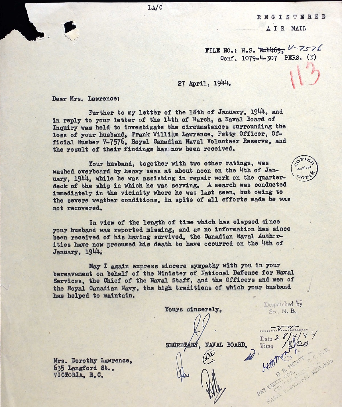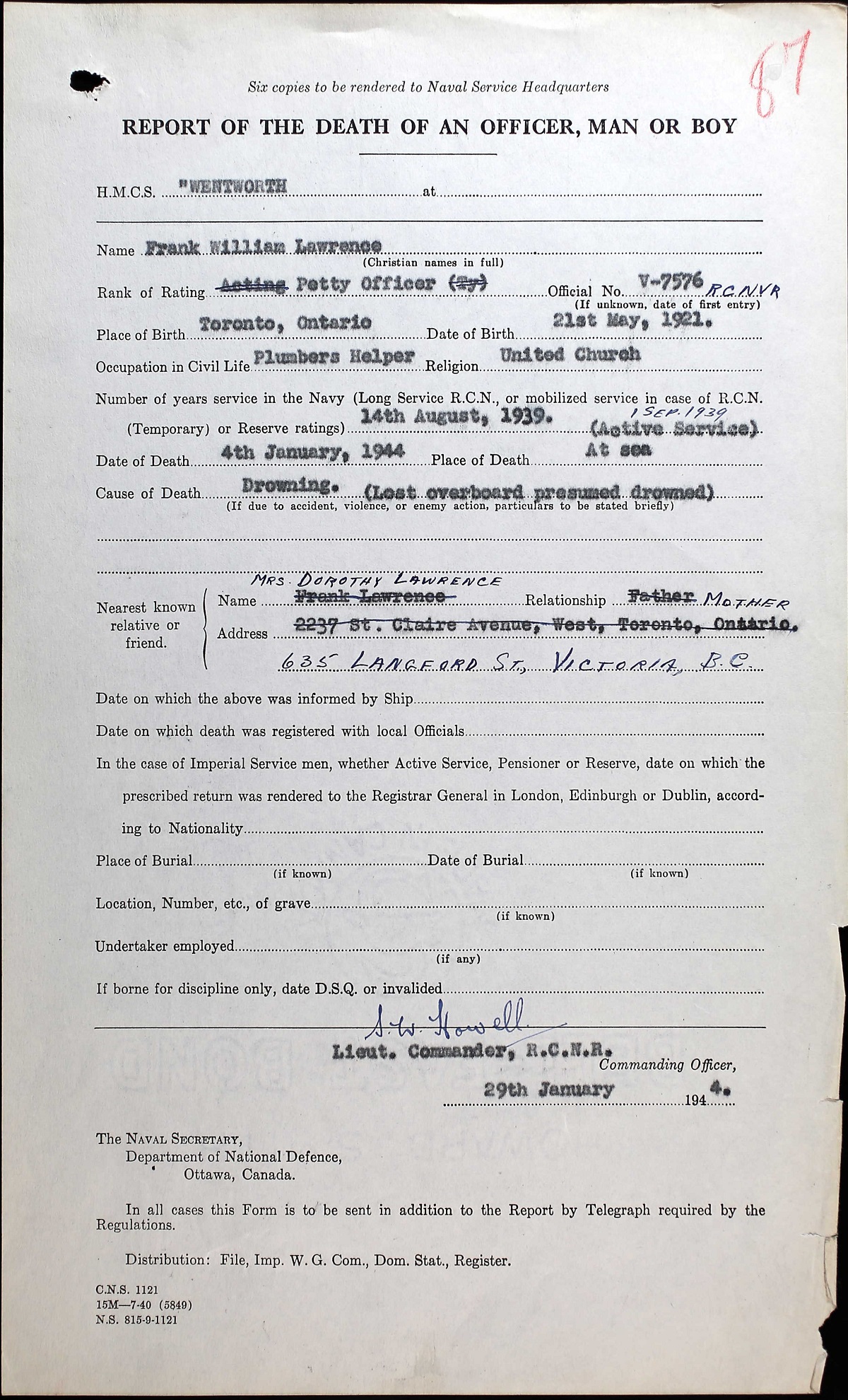 LAWRENCE, Frank William PO, V7576, RCNVR, MPK - 04 Jan 1944, HMCS WENTWORTH - Son of Frank and Margaret Lawrence, of Toronto, ON; husband of Dorothy Stella Lawrence, of Victoria, BC.